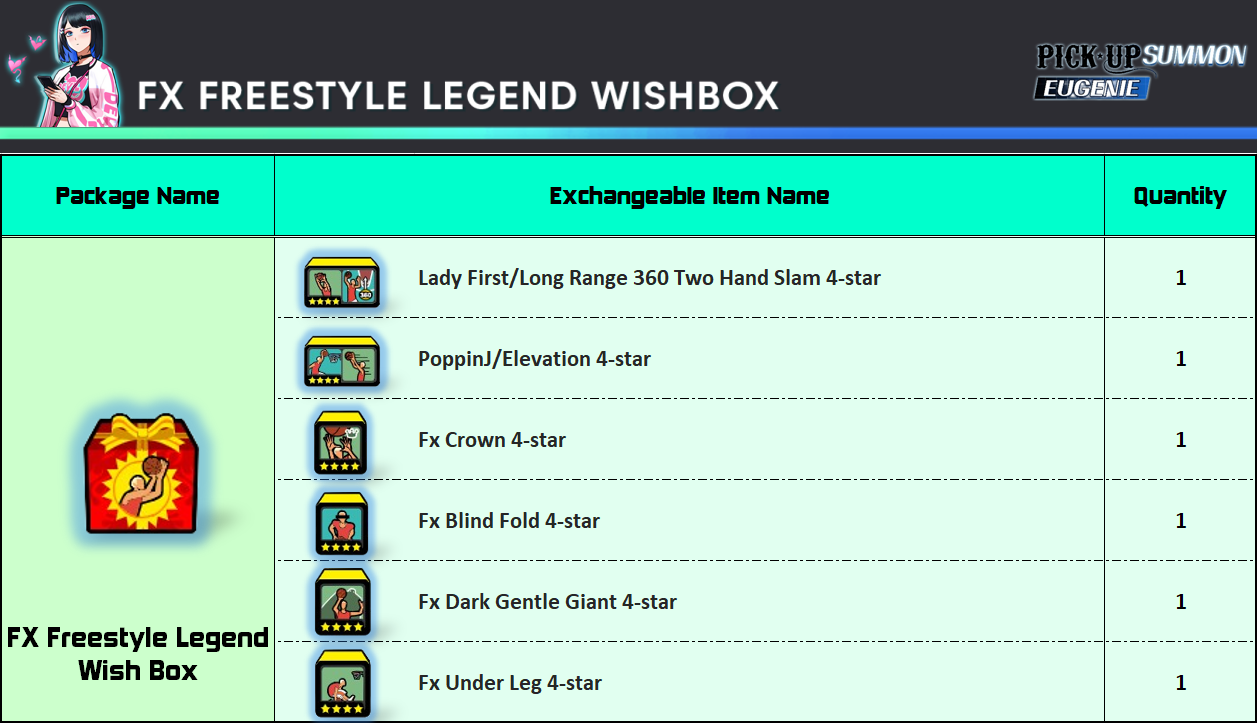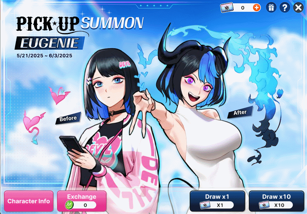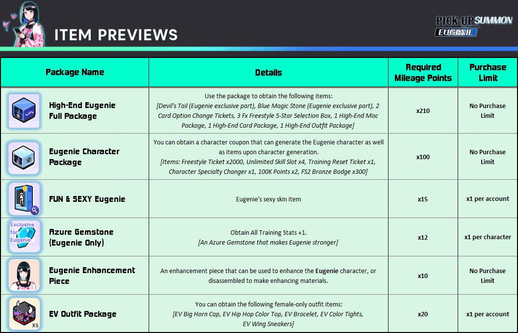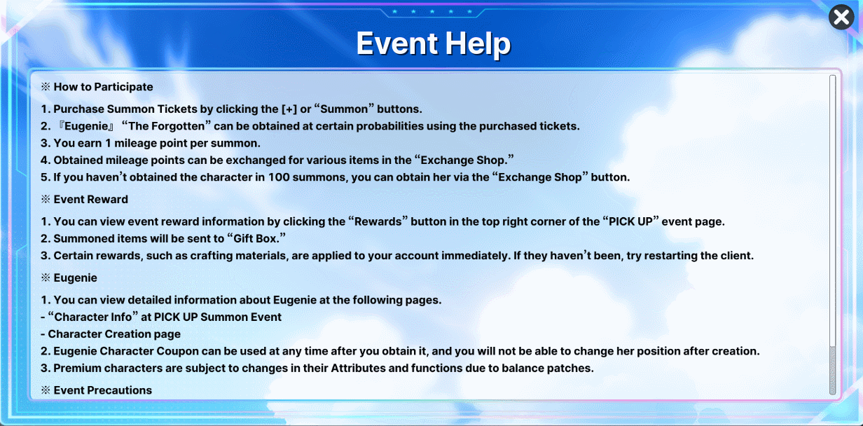 [color=cyan]Purchasing:[/color] [1] Purchase 'Summon Tickets' by clicking the [+] or "Summon" buttons. [2] The Forgotten: Eugenie can be obtained at certain probabilities using the purchased tickets. [3] You can earn 1 Mileage Point per summon. [4] Obtained Mileage Points can be exhanged for various items in the "Exchange Shop". [5] If you haven't obtained the character in 100 summons, you can obtain her via the "Exchange Shop" button.