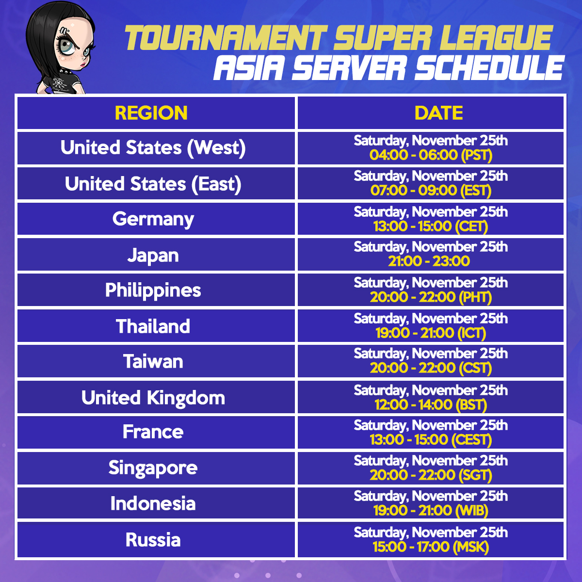 Both the Super Tournament and Crew Tournament will be held three (3) times on November 25, 2023 (PST).