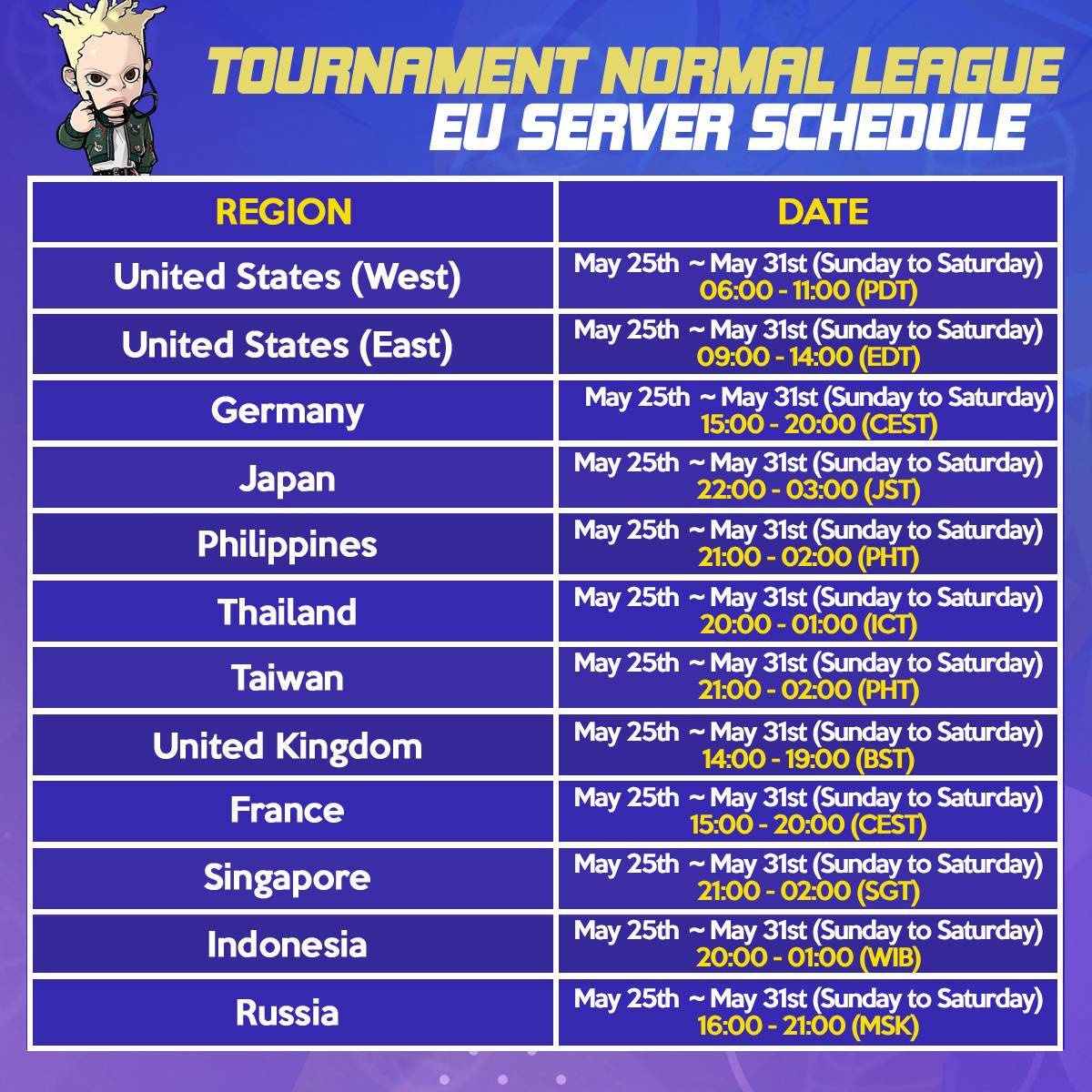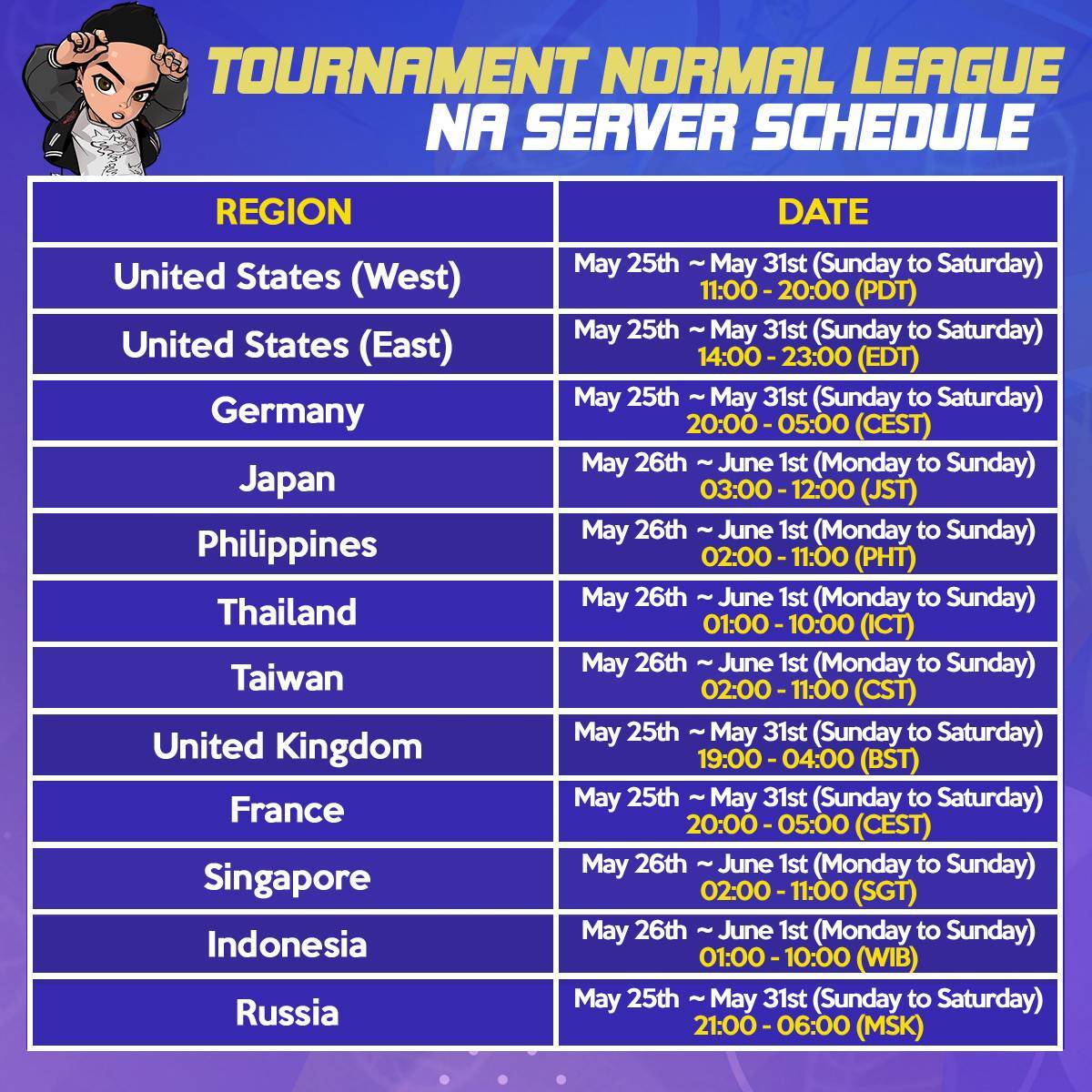 [table] [tr] [td]United States (West)[/td] [td]Tuesday, April 29th 23:00 ~ Wednesday, April 30th 02:00 (PDT)[/td] [/tr] [tr] [td]United States (East)[/td] [td]Wednesday, April 30th 02:00 ~ 05:00 (EDT)[/td] [/tr] [tr] [td]Germany[/td] [td]Wednesday, April 30th 08:00 ~ 11:00 (CET)[/td] [/tr] [tr] [td]Russia[/td] [td]Wednesday, April 30th 09:00 ~ 12:00 (MSK)[/td] [/tr] [tr] [td]Japan[/td] [td]Wednesday, April 30th 15:00 ~ 18:00 (JST)[/td] [/tr] [tr] [td]Philippines[/td] [td]Wednesday, April 30th 14:00 ~ 17:00 (PHT)[/td] [/tr] [tr] [td]Thailand[/td] [td]Wednesday, April 30th 13:00 ~ 16:00 (ICT)[/td] [/tr] [/table] [color=orange]Maintenance Details:[/color]