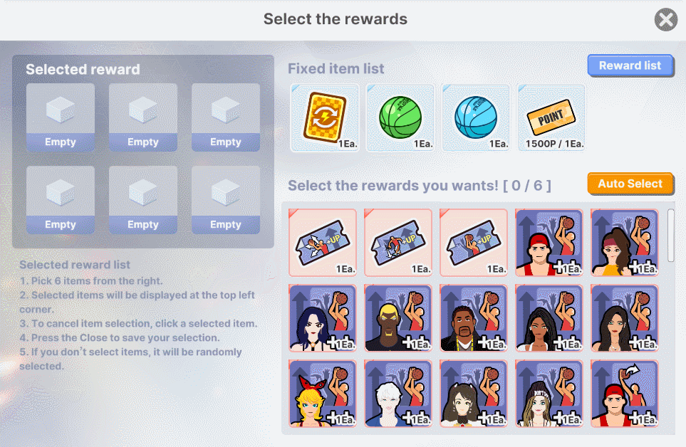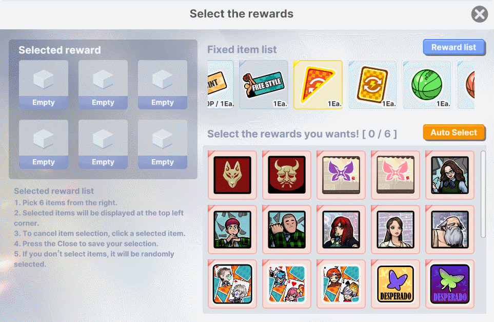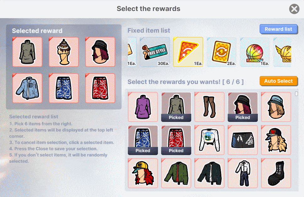 Select 6 items from the reward list.