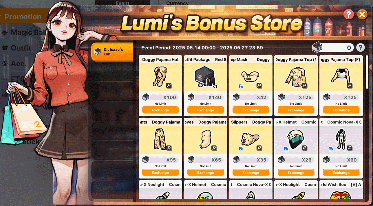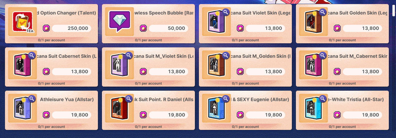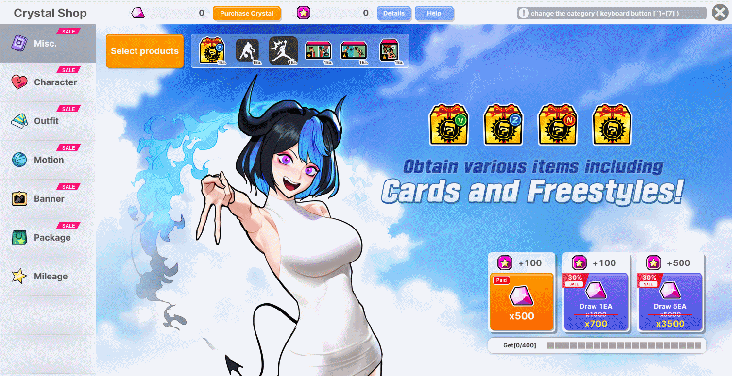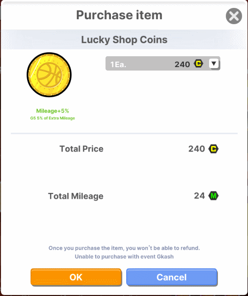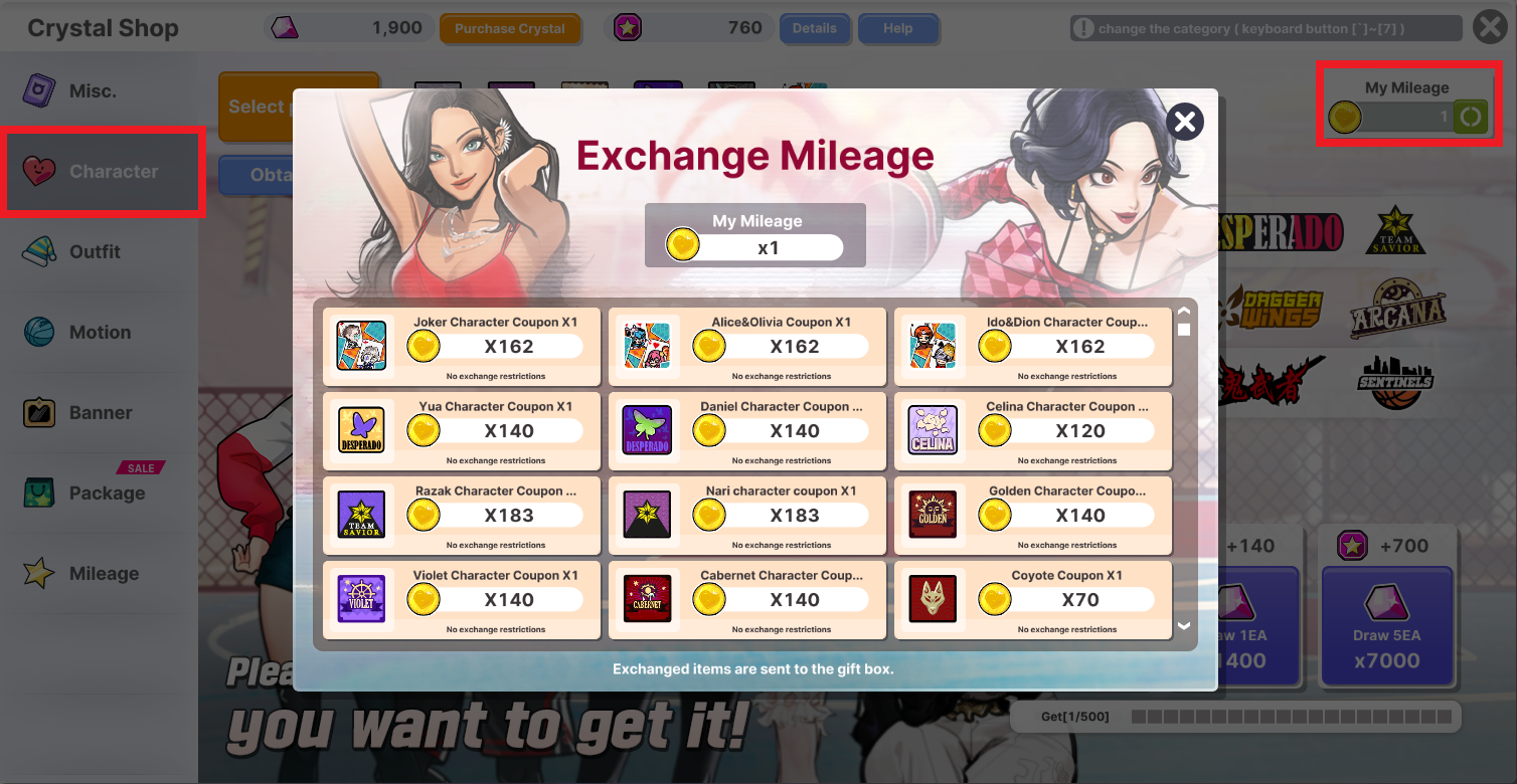 1. Mileage products are bonus benefits for you. 2. You can obtain Mileage by drawing in each category. 3. You can exchange Mileage for the products below. 4. Character-limited products will be moved to the Locker, and other products will be sent to your gift box. 5. The Mileage price for some items may be adjusted through updates.