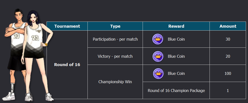 [color=orange]Note:[/color] 1. Coins will be obtained by characters. 2. Displayed reward for playing and winning is the amount granted per match. 3. Amount of coins will be deducted accordingly in case of winning by default. 4. Obtained coins can be used to purchase various items at the Tournament Shop.