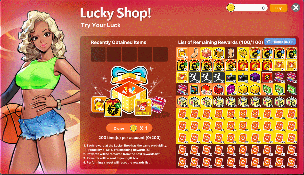 [1] Each reward at the Lucky Shop has the same probability. [color=gold](Probability = 1/No. of Remaining Rewards(%))[/color] [2] Rewards will be removed from the next rewards list. [3] Rewards will be sent to your [color=gold]Gift box[/color]. [4] Performing a Reset will reset the rewards list.
