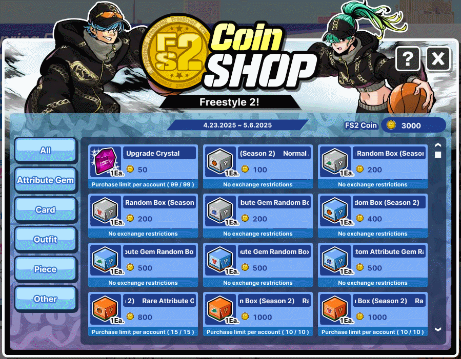 - Just by logging in during the event period, you'll receive a bonus of [color=lime]1000 Coins[/color]. These Coins can be used to exchange for any desired item from the FS2 Coin Shop, provided you have enough coins for it. - Get [color=lime]100 Coins[/color] per regular match. (Maximum of 10 Matches per day = 1000 Coins) - Exchanged items can be found in the Gift Box, and any remaining coins will be removed after the event ends.