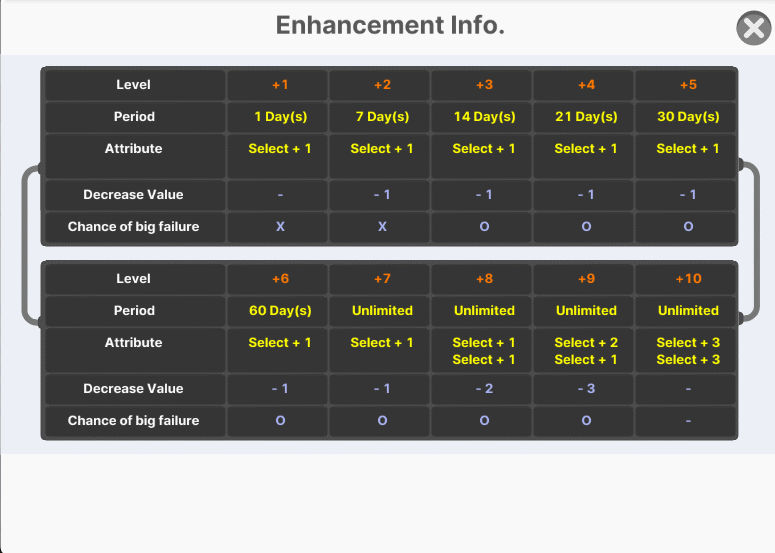 → After a successful enhancement, the duration of use or attributes will increase based on the grade.