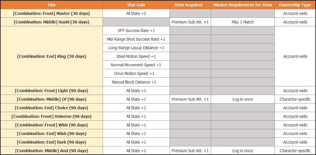 [color=red]~ New combination titles can be obtained through the “Master Sushi King” and “The Genesis of Cosmos: Light” events. ~ The titles [Of] and [And] are character-restricted items.[/color]