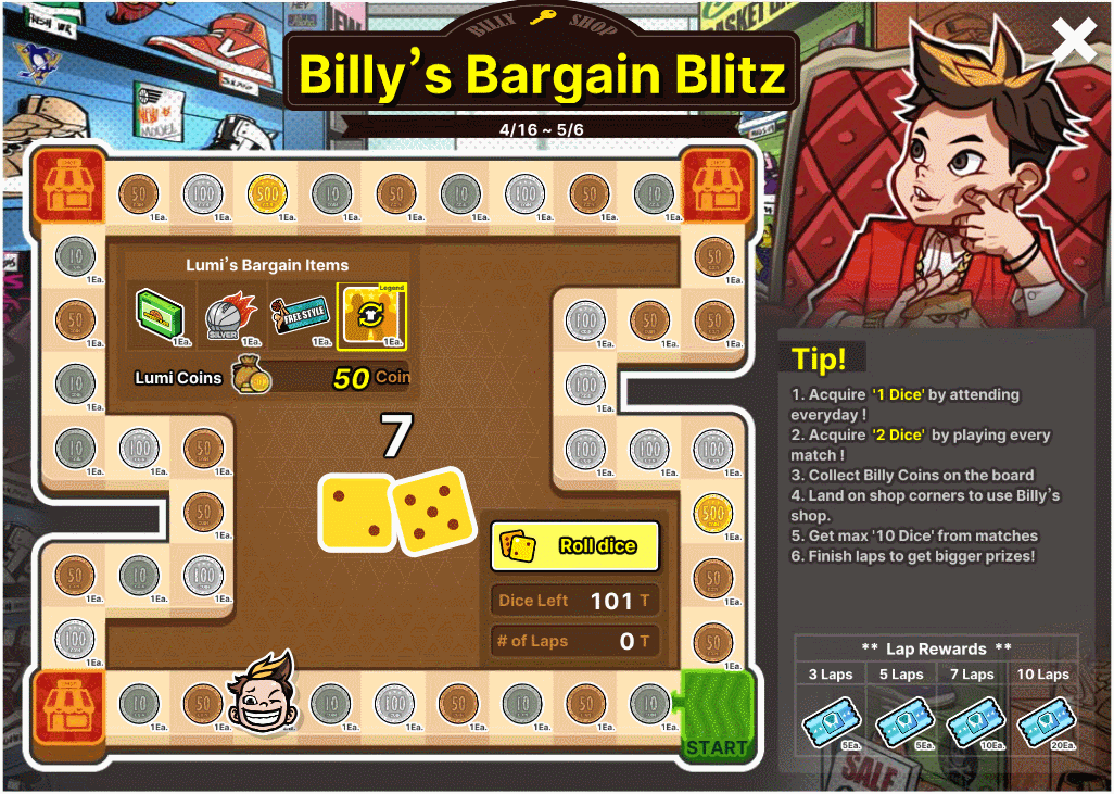[1] Earn One (1) Dice daily just by logging in! [2] Receive Two (2) Dice for every match played! [color=gold](*Earn up to ten (10) Dice per match - maximize your chances!)[/color] [3] Collect valuable Billy Coins along your journey. [4] Land on shop corners for exclusive deals at Billy's shop.