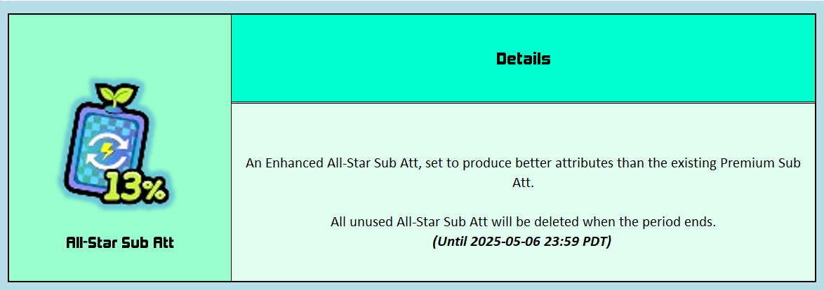[color=darkorange]All-Star Sub Att:[/color] > This is a seasonal Sub-attribute that grants a better chance than the sub-attribute or Premium sub-attribute for your desired option.