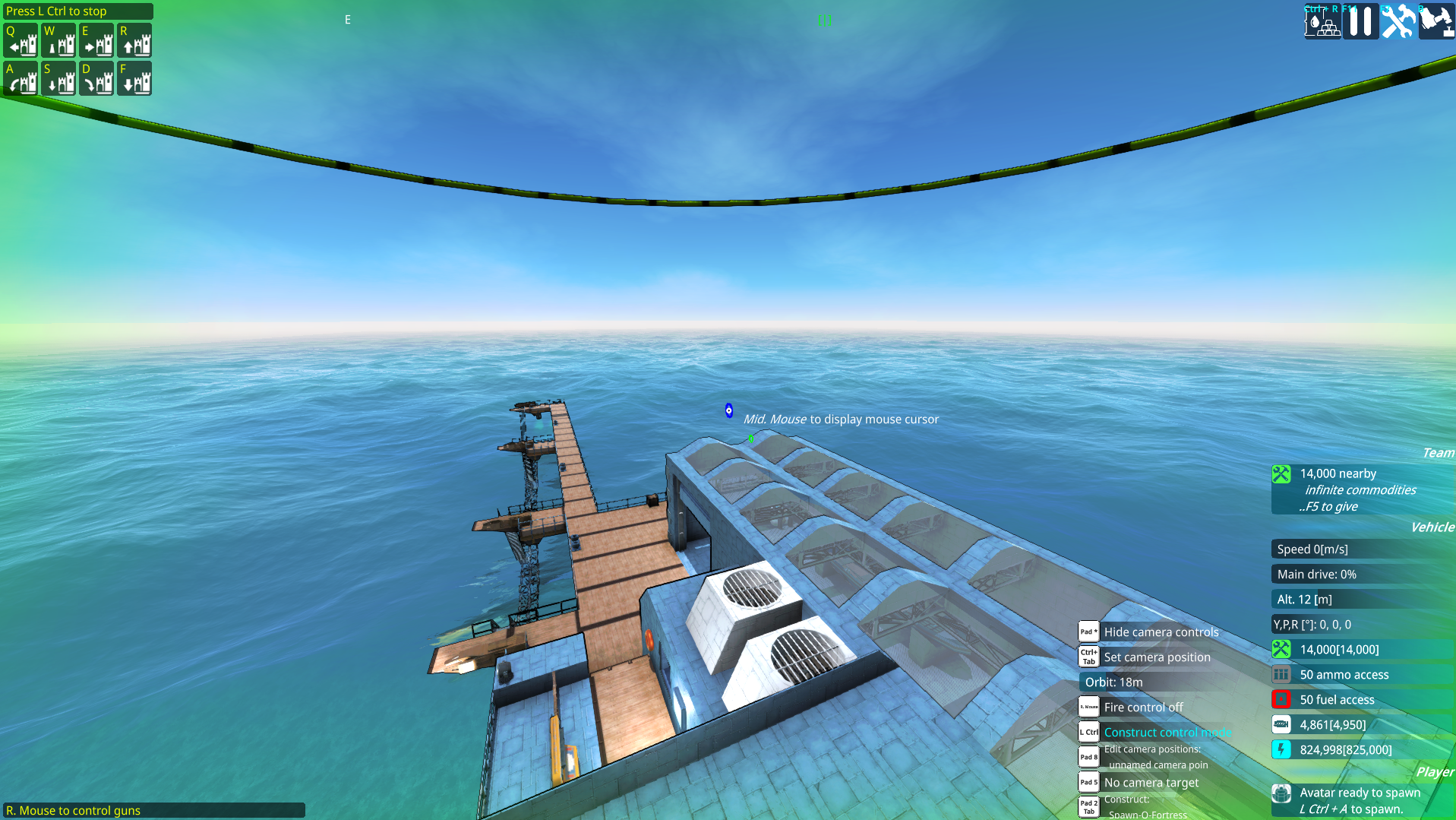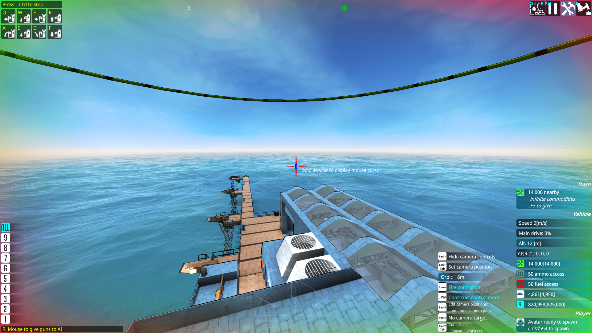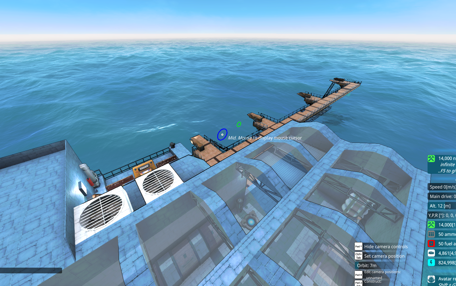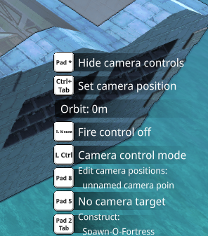 Camera, There is a specific free-camera mode that can be used to move the camera around the world Camera, Construct camera points can be set to be maintained above water Camera, Construct camera points can be set to hide your vehicle during weapon aiming if your construct gets in the way to maintain your line of sight Camera, Construct camera points can be set to visually tunnel through your vehicle during weapon aiming to maintain your line of sight Camera, Construct camera points can be set to move forwards when aiming to maintain your line of sight Camera, Construct camera points can be set to ignore vehicle roll, pitch, or yaw. Camera, Construct camera points can be named / moved / rotated. Camera, Construct camera points can be easily 'saved' using CTRL + TAB to snap them to the current position of the camera Camera, Construct camera points can be easily 'loaded' using TAB to snap the camera to the saved position Camera, Construct camera points can be easily moved using WASD ALT and SPACE when not driving vehicles Camera, Primary camera modes can focus enemy vehicles by left clicking on them.