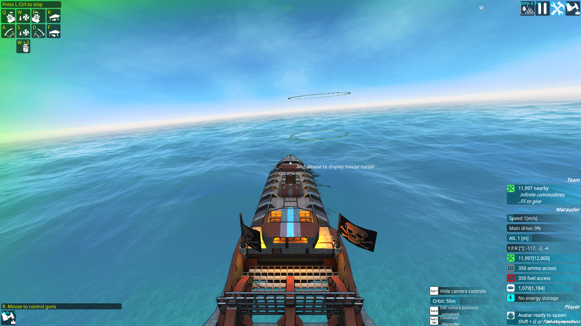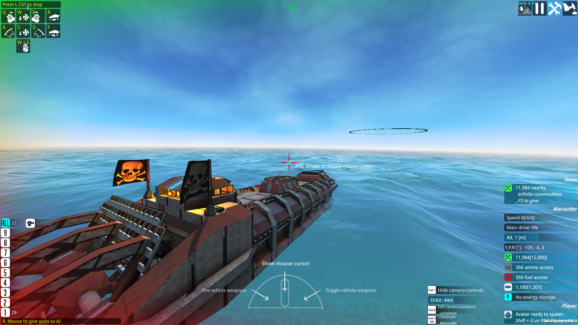 Weapon control When your avatar is on a vehicle or your construct-mode camera is activated on that vehicle you will be able to control all weapons on the vehicle. Weapon control Right click activates/deactivates vehicle weapon mode Weapon control There is no 'off' / 'AI' slot for weapons anymore. Deactivate (right click) weapon mode to stop aiming/firing. Weapon control With the mouse cursor visible (middle click) you can aim weapons using the mouse cursor. In free look mode you can aim weapons using the centre-of-screen cross hair. Weapon control There is now a red vignette in the corner of the screen when in weapon control mode to remind you that you are in weapon control mode