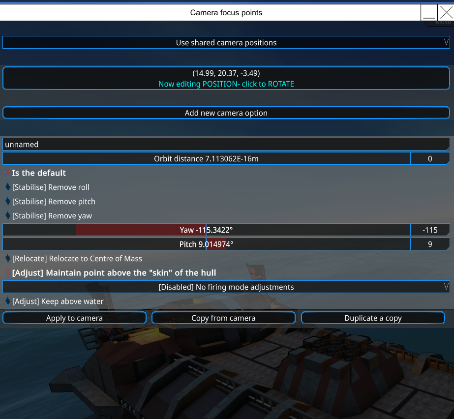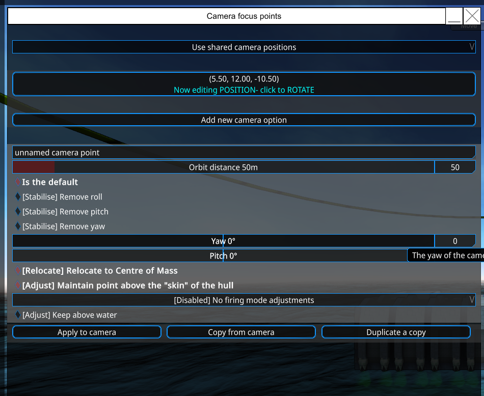 In camera edit mode you can add more advanced options to the camera. Add new camera positions, stabilise its pitch,yaw and roll, keep it above water and so on. By manipularing these you can create unique viewpoints that mirror other games. Like creating an arcade plane viewpoint or a boat view akin to world of warships.