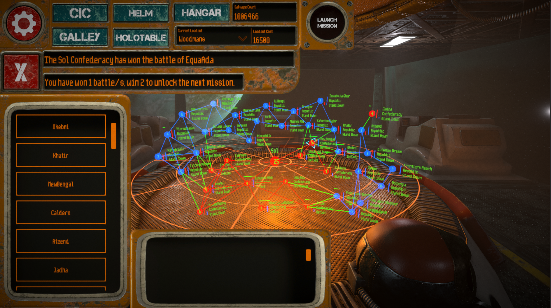 - Conversation box in the CIC will now flash the blue button to indicate that a new conversation is ready to progress. - The WARMAP now has a news ticker and text box that will tell you what your next objective for Chapter 2 is. - Cutscene cinematics will now play at key points in your journey, there are currently only 2 with plans to add more. - Post mission scoring has been update to include a host of new enemies. - New holotable maps for both previously added and new levels. - Reworked AI for better difficulty scaling across the entire campaign. - Added voice over for Lancer Squadron and made tweaks to when they will join a WARMAP fight. - Added weapon slot names to the HANGAR menu. - Modified rendering visibility for numerous UI elements to include the waypoint indicator. - Adjusted tunnel runs on the Frontiers Reach and Bodenga maps to reduce difficulty. - Changed how the Helm menu displays locations. It will now only show a location if you have a mission there. - Reworked vessel rescue missions. - Tweaked the Shuriken Ultra player fighter to better affect it's performance during gameplay. - Wingman artwork has been update with additional wingmen being added. These new wingmen will be award when you've completed a side quest chain without breaking it. - Tweaked capital ship voices to reduce volume and repetitiveness. - Numerous tweaks to artwork to affect better performance across all levels. - New weather VFX have been to added both the Poseidon's Throne and Astraeus Slumber maps. - Added 4 new side quests chains for a total of 14 additional side quests that can be obtained through conversations in the GALLEY. -