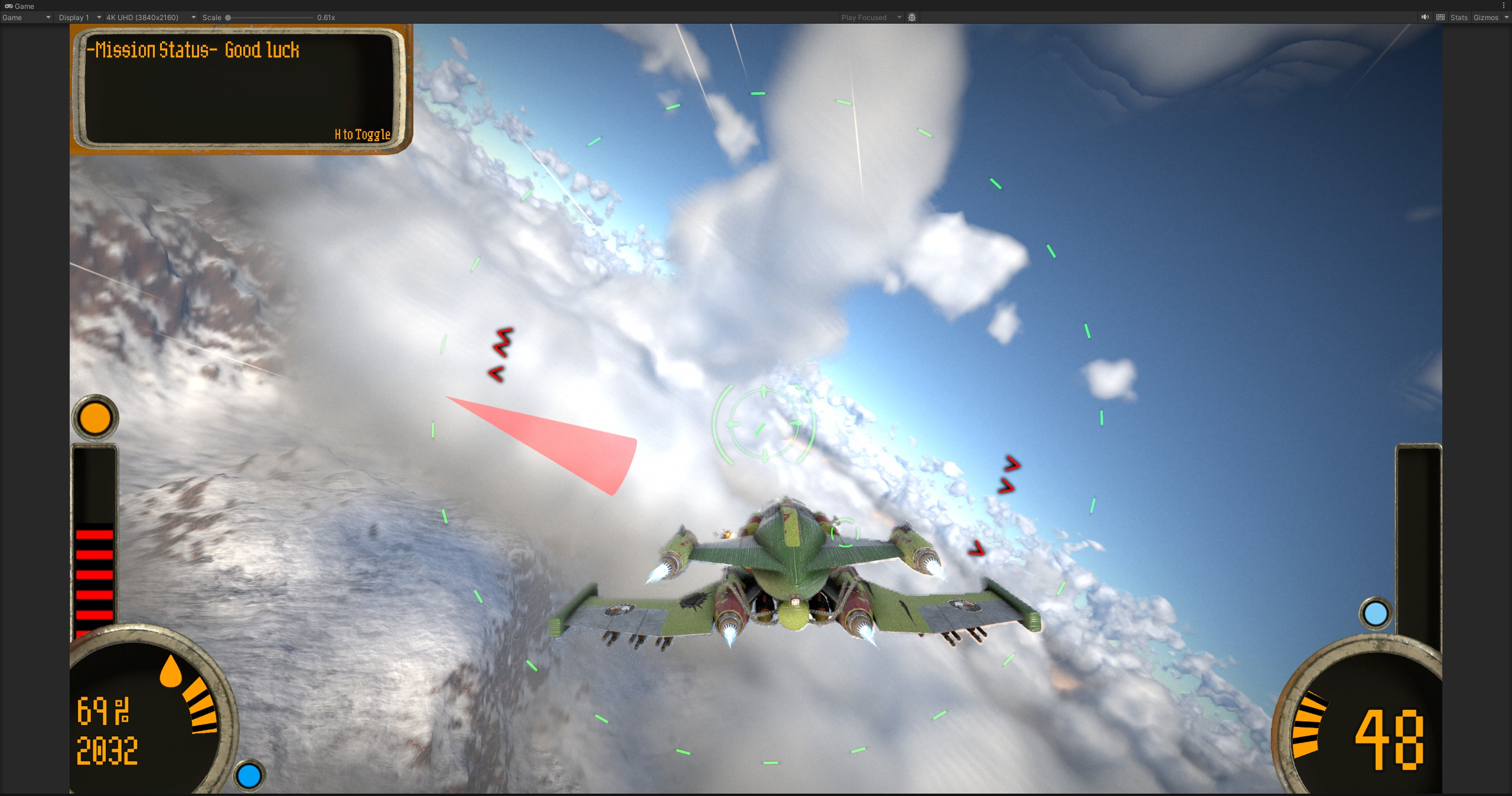 My intention for MoFR is to have a 3 player PvE game where you can fly and fight in the skies of alien worlds. From low orbit after you launch from the carrier Fortunes Favor all the way down to the surface of a planet. While the play areas will still be constrained I've already done some experimental work where these contained areas are as large 80x80 kilometers squared. Resulting in a total horizontal play space of about 6400 kilometers. And that's ignoring the additional 80 kilometers of vertical play space to get up to space and back down to a planet. And this will include a mostly seamless transition from space to planet and back again.