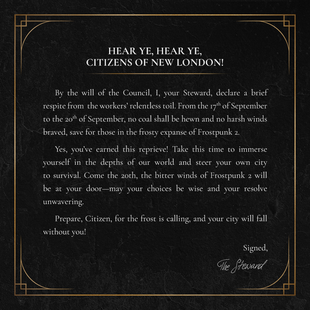 In these challenging times, both in New London and in our world, your enthusiasm and support have been a source of warmth for our team. While the frost may be unrelenting, the community's spirit remains unbreakable. From all of us at 11 bit studios, thank you. Your trust in us, your dedication to the game, and your feedback make all the difference. As we continue this journey together, remember: in Frostpunk 2, every city you build, every decision you make, contributes to our shared story of survival and hope. Citizens of New London. Our future rests in your capable hands. Even when facing challenges - stay strong and enjoy the ride! And as always remember - โThe City Must Not Fallโ!