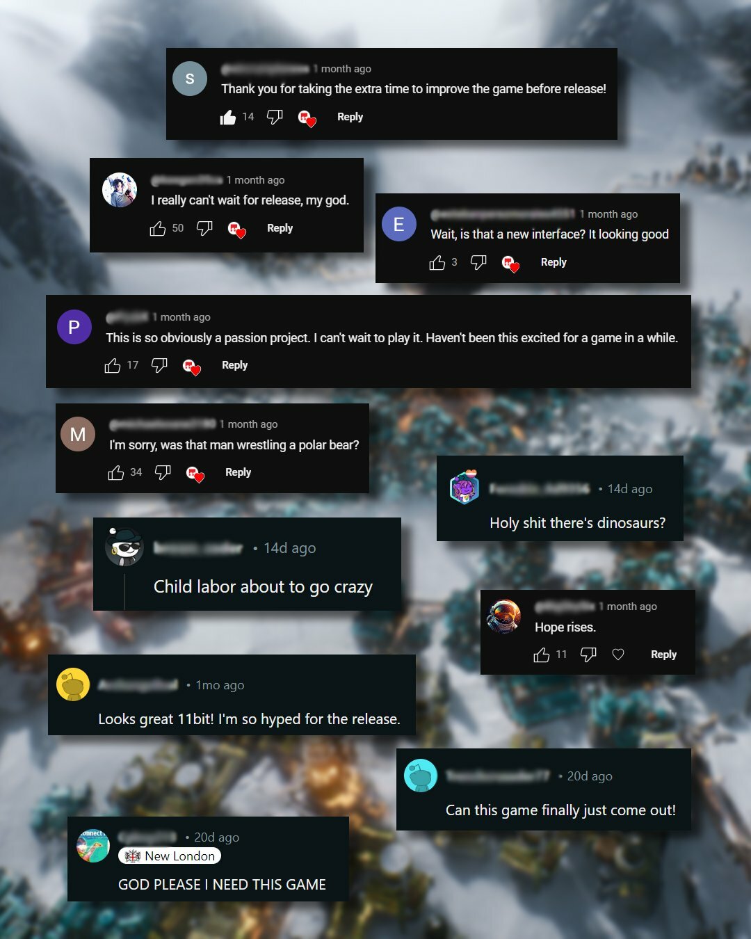 We at 11 bit studios are thrilled to share this trailer with you! But we believe the true excitement lies in your own journey of discovery. It is about time that you become the one making the difficult choices, balancing the needs of your people against the harsh realities of our frozen world.