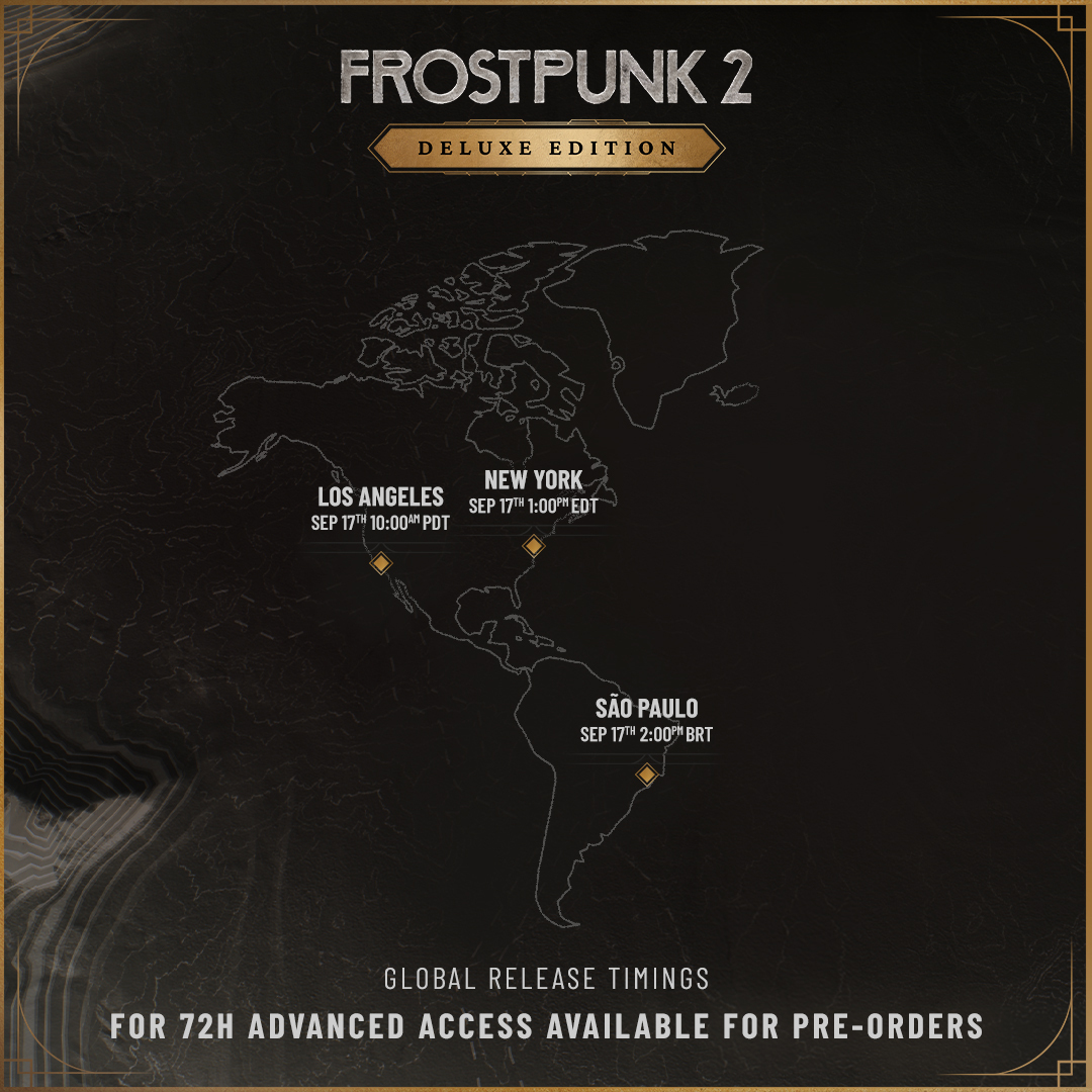 Our scouts have braved treacherous conditions to bring you this crucial intelligence: a map revealing the exact moments when Frostpunk 2 Advanced Access will become available across our frozen globe. Prepare yourselves, for the time draws near.