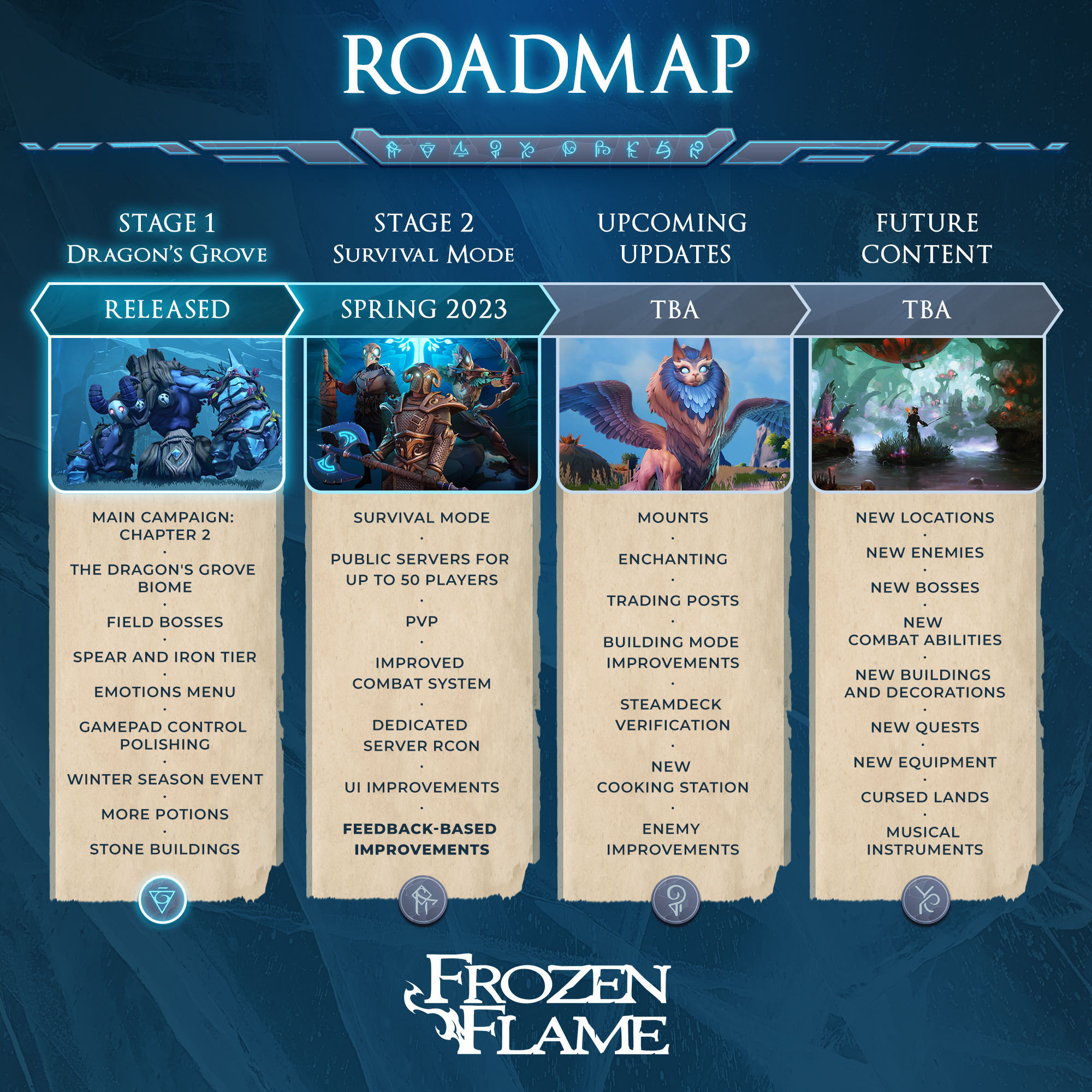 We recently conducted a survey on our Discord channel to gather your thoughts and ideas on what you'd like to see in the future of Frozen Flame. We're grateful for your participation, and we've taken your suggestions to heart. Based on the results, we've adjusted our development roadmap to better align with your expectations.
