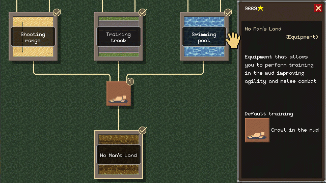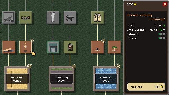 Each equipment gives access to other trainings, that raise one or more of the recruit's skills but also affect stamina and stress. They can be ugraded, giving much more skill value at the same cost.