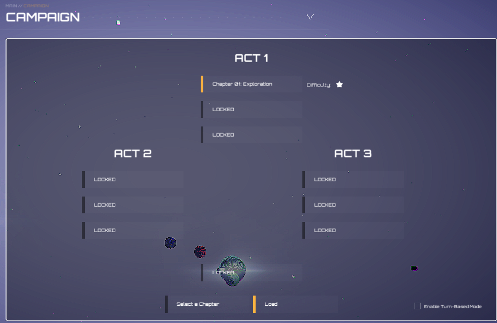 The campaign will span 9 Chapters. Each Chapter will consist of very specific and different objectives that will have to be completed to continue. The difficulty of each Chapter varies greatly and this is marked by the stars in the Campaign menu.