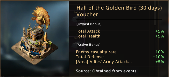 Participation matters and winners deserve the rewards. Exclusive Hall of the Golden Bird Coupon (7-day) that can help increase the enemy casualty rate and increase total attack, a Crest of Might Badge that helps with the total attack, Blessing Stones, Glory Raffle Tokens… Check out below the details about the rewards of the Glorious Battle.