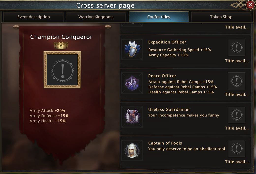Not only will the Champion Conqueror receive special privileges like conferring titles and granting rewards to anyone from the kingdoms that have participated that siege, but also will be able to get 500,000 diamonds, unique badges, and a special marching effect!