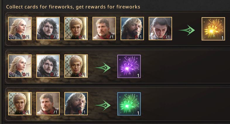 During the event, you can collect 8 kinds commander cards to redeem fireworks of 4 different level then RELOCATE to somewhere close to a Great City of your choice to light them up. There are 4 time slots you can choose to fire them: 0:00-01:00, 06:00-07:00, 12:00-13:00, 18:00-19:00 GMT. Every fireworks will grant you with Spirit of Weirwood Tree, Speedups and many other items.