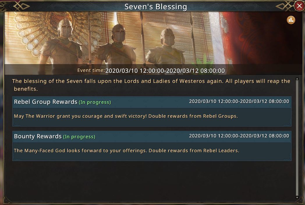 May the seven bless you. You will receive different buffs continuously during this period. Not only double rewards from Weirwood Tree will be availabl, but also damage increase for Alliance Bosses and extra Diamons for Auction. Keep an eye on the buffs and obtain the most rewards possible! Check out the buffs below: - Double Rewards for Weirwood Tree Trials, - Double Rewards for attacking Rebel Groups and Leaders, - Double Rewards for completing Alliance Quests, - 10% increase of your gathering speed, - 20% increase of your damage to Alliance Boss - Extra Diamonds for Auction!