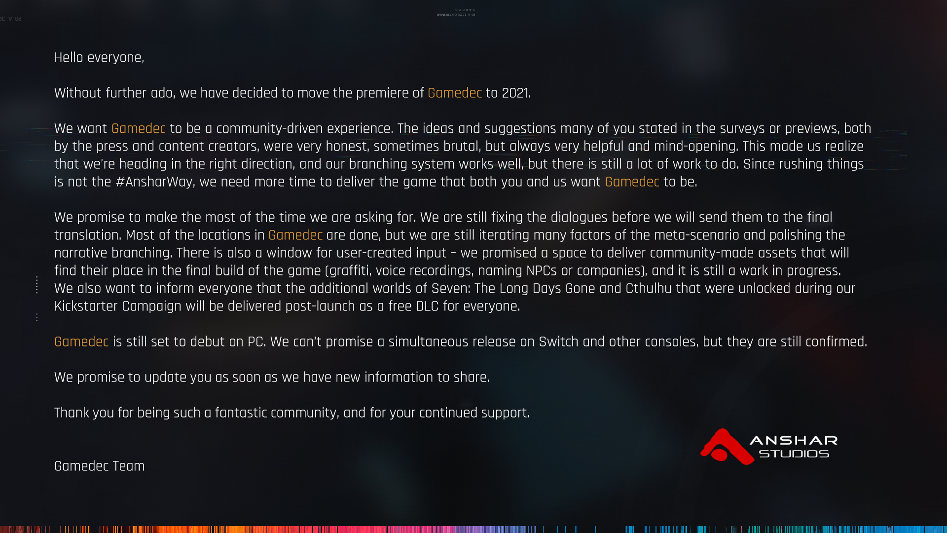 Gamedec is still set to debut on PC. Switch and other consoles are still confirmed, but we can't promise a simultaneous release.