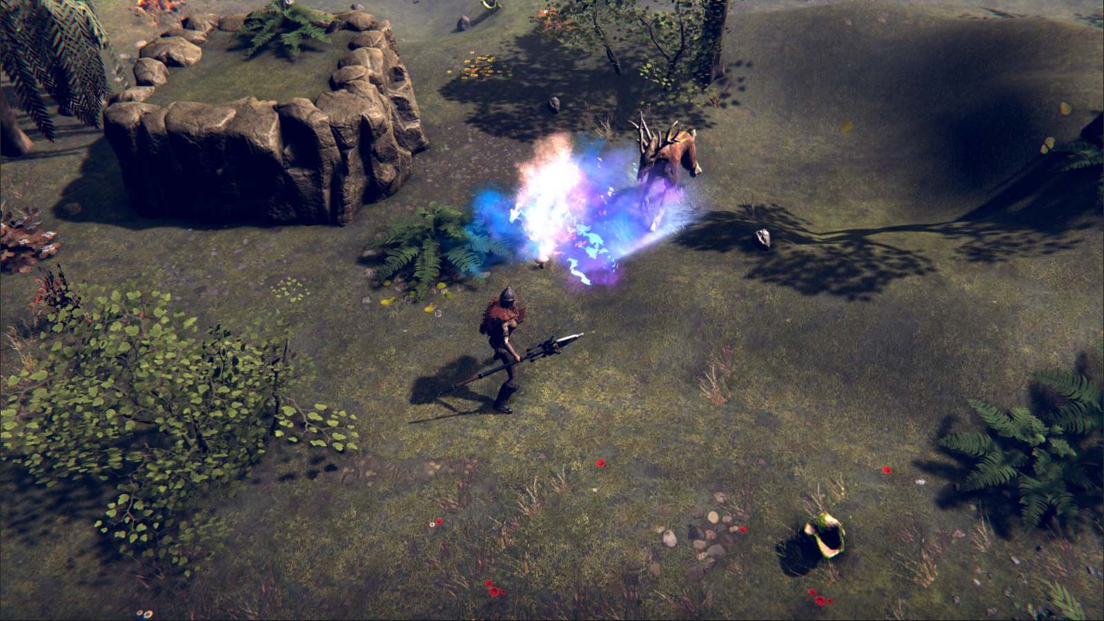 The Hatchet is a simple but deadly weapon if used by the right person. It is a one-handed mid-range weapon as well as a melee weapon. The key mechanic of this weapon is based on two states: (1) throwing and (2) rage. The combat is initialized by throwing (default state), allowing the Player to poke an enemy from mid-range. Throws resulting in enemy hits stack the bleeding effect in this state, which increases the rage counter. At any time, the Player can use its ultimate ability to deal massive damage (based on the number of rage stacks on enemies) and change the state to Rage. Mid-range abilities change into melee combat spells that allow diving into close combat in the Rage state.