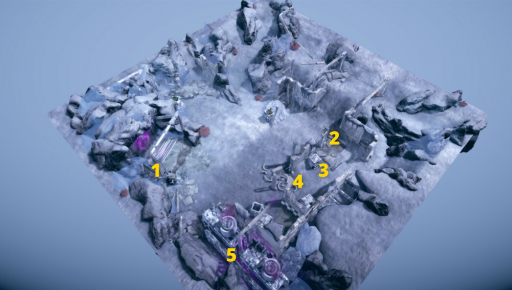 Before you reach the Ancient Iron Mine, you will have to figure out how to open the door (1). Howling winds and snowstorms destroyed the whole area, so be prepared for a lot of rubble and piles of junk (2),(3),(4). You will have to deal with them to find a battery and enter it into the steering machine (5).