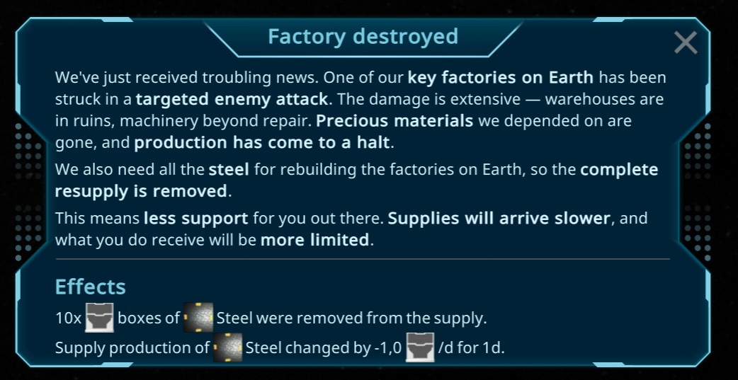 Events now occur randomly over time and can include multiple effects at once. For example, supply routes from Earth might get disrupted: storage can be reduced, production priorities may shift, or certain resources may temporarily increase in cost. Think of a steel factory back on Earth breaking down – suddenly, your ship has to adapt.