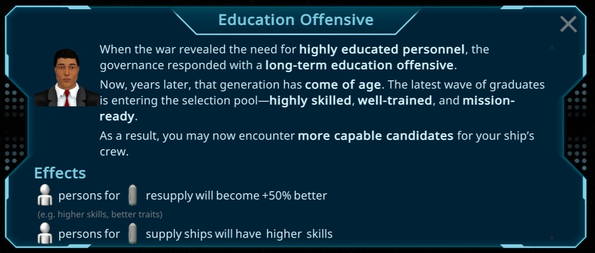 Crew skills are now more flexible and evolve with your progress. Early in the game, new crew members don’t demand much in terms of living conditions. As you achieve major objectives, better-trained crew will arrive. Some events can also lead to better—or worse—personnel joining your mission.