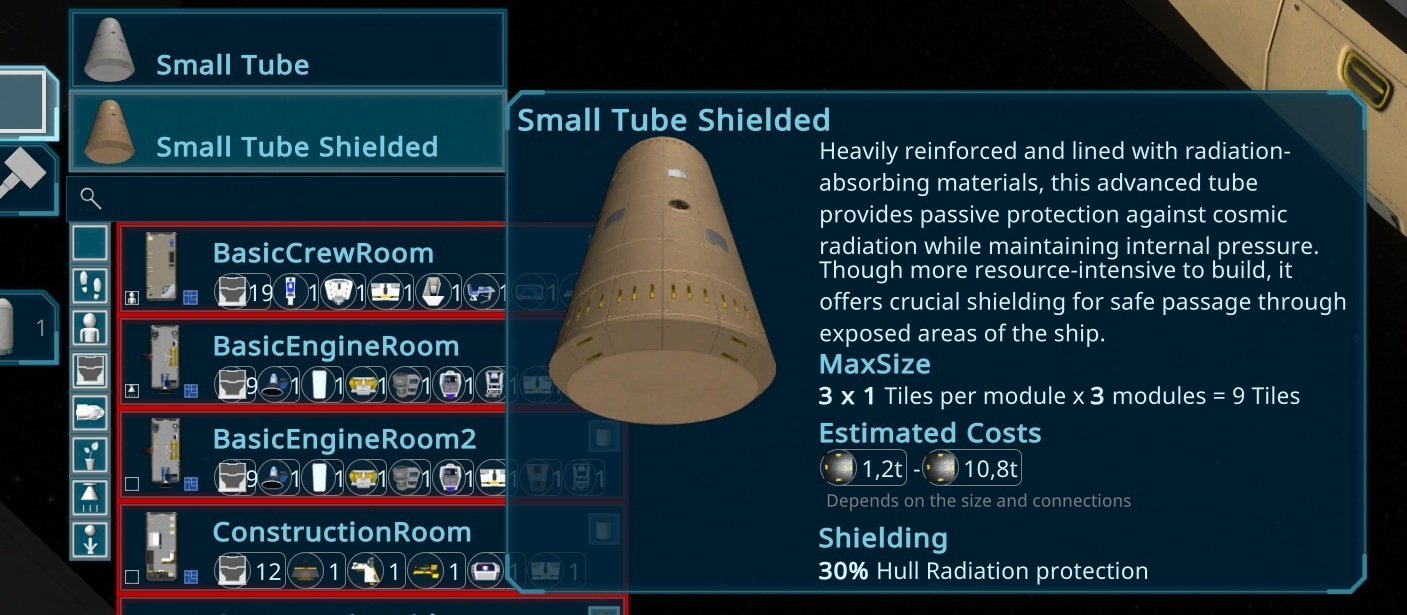 There are now different ways to improve radiation protection. One of them is the ship's hull. A second room type is now available, using more resources but offering better passive shielding through improved construction. To support this, the Room Editor received a major overhaul.