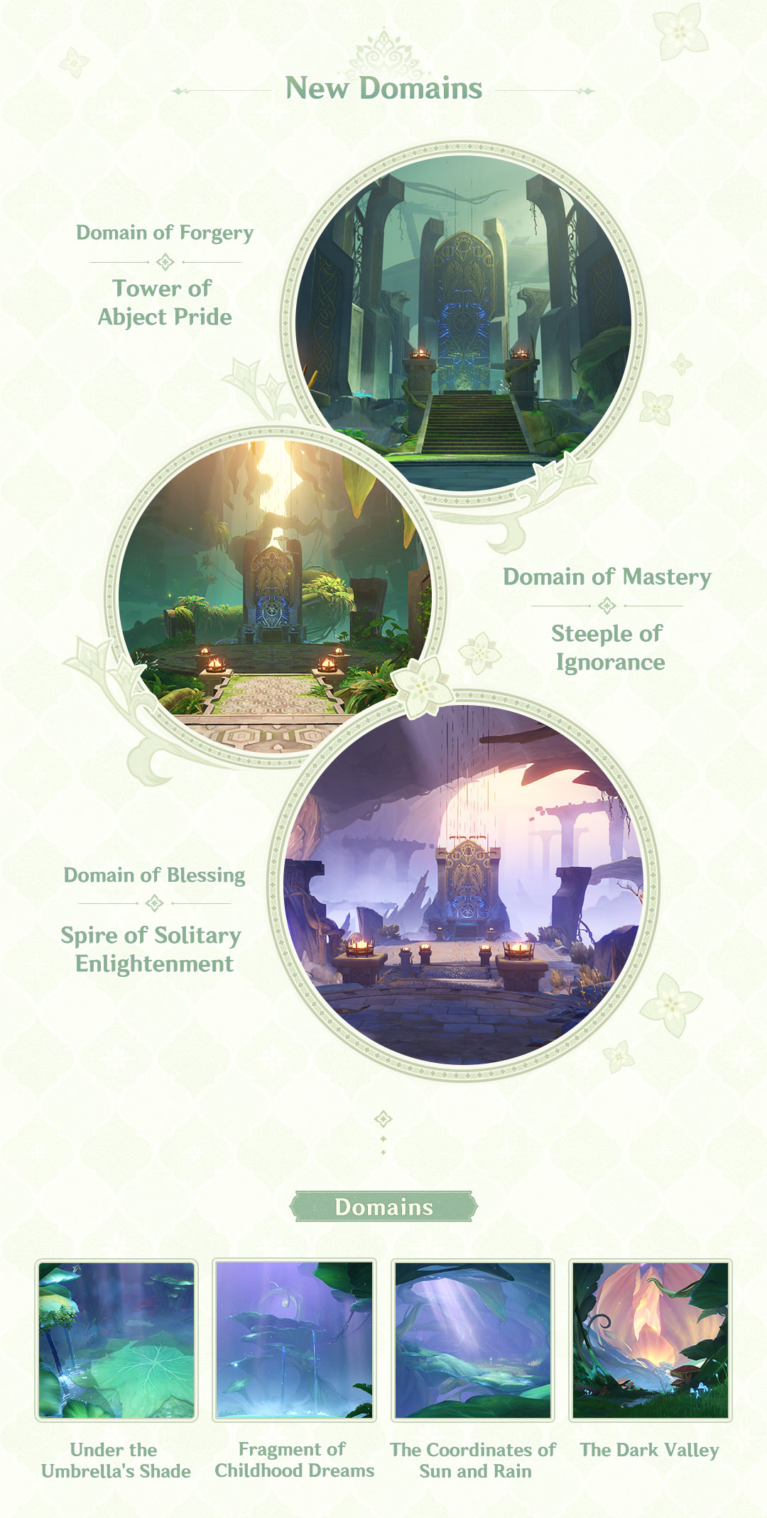 3. New Domains: Domain of Forgery "Tower of Abject Pride," Domain of Mastery "Steeple of Ignorance," Domain of Blessing "Spire of Solitary Enlightenment," and others