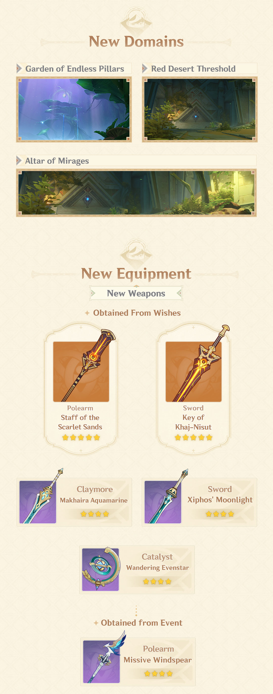 ◆ The 5-star character "Verdant Strider" Tighnari (Dendro) will be available in the standard wish "Wanderlust Invocation" in the next Version.
