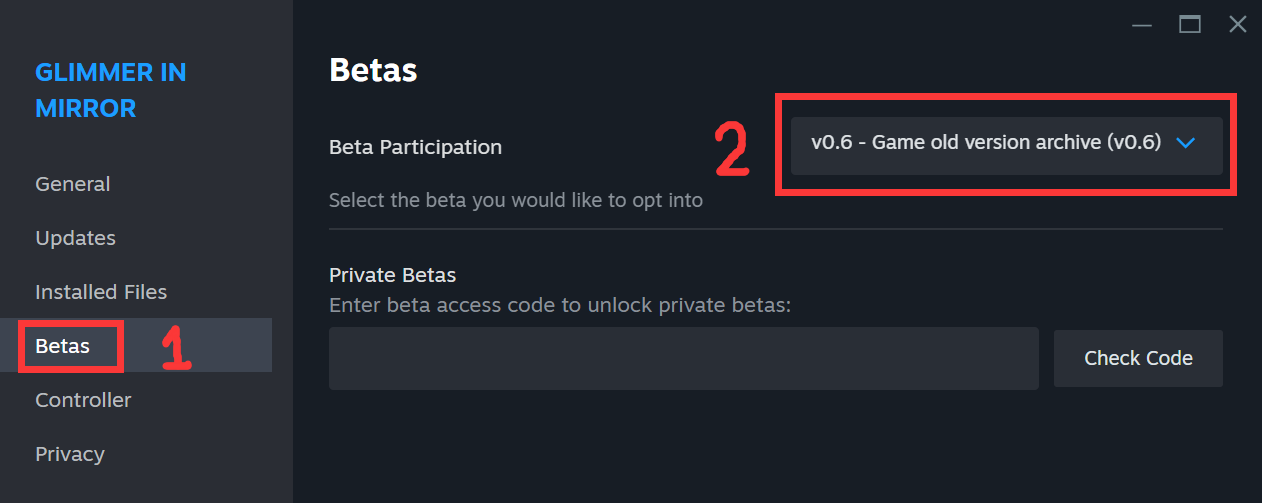 Right-click on Glimmer in Mirror in your Steam library, select "Properties," go to the "Betas" tab on the right side, and choose "v0.6" in the "Select the beta you would like to opt into" section. Select "None" to switch back to the default branch: