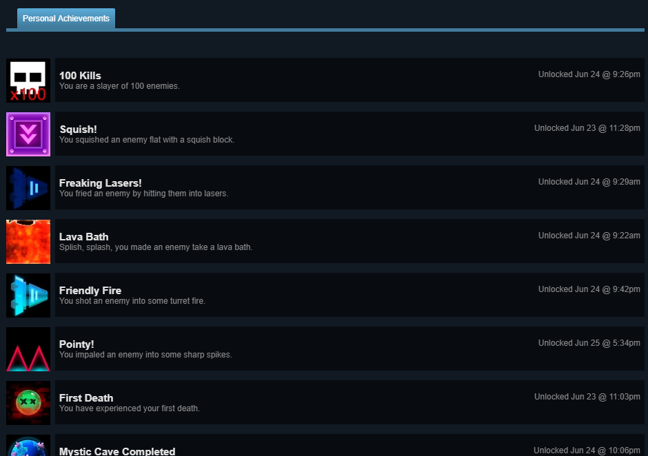 This build mainly focused on achievements and SFX improvements. We added 26 Steam Achievements to the game!