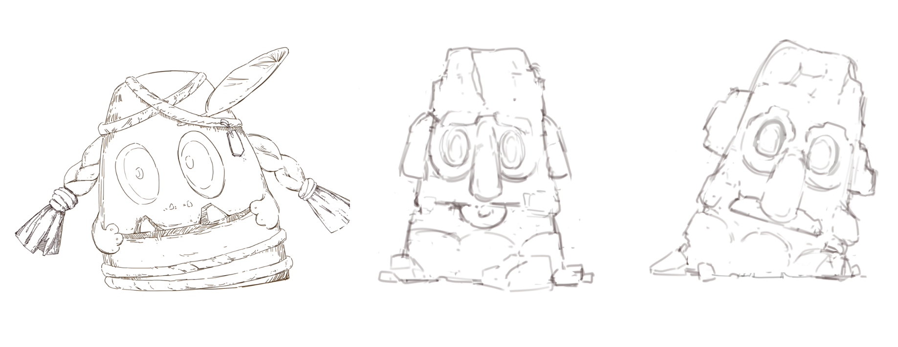 As you may have noticed, each shrine statue has some similarities in its features, such as the trapezoid-shaped head, oval eyes, wide mouth, and sometimes accessories. We also made sure to add environmental elements to the final design, such as bushes, plant growth, splotches of moss, and even spiderwebs.