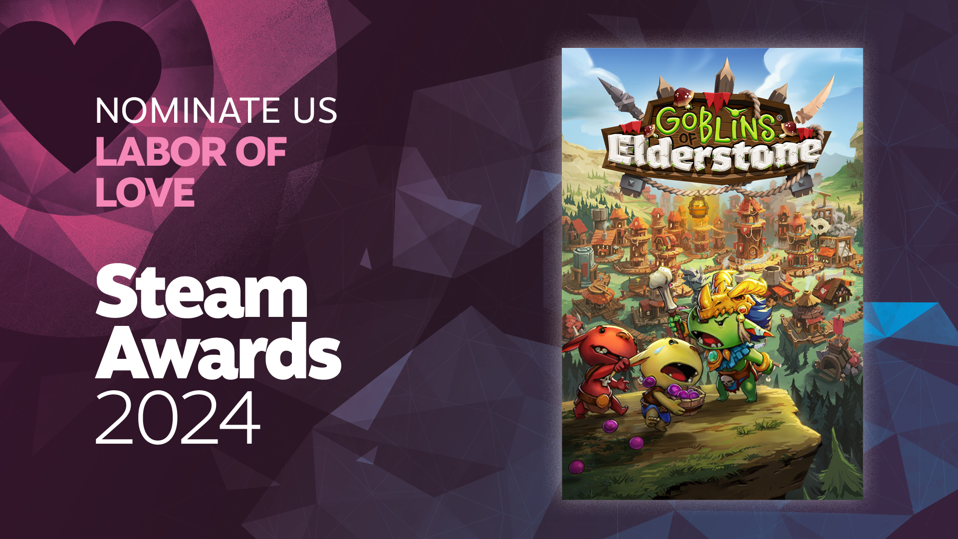 We kindly ask for your support in recommending Goblins of Elderstone as a nominee for the 'LABOR OF LOVE' category in the upcoming Steam Awards 2024!