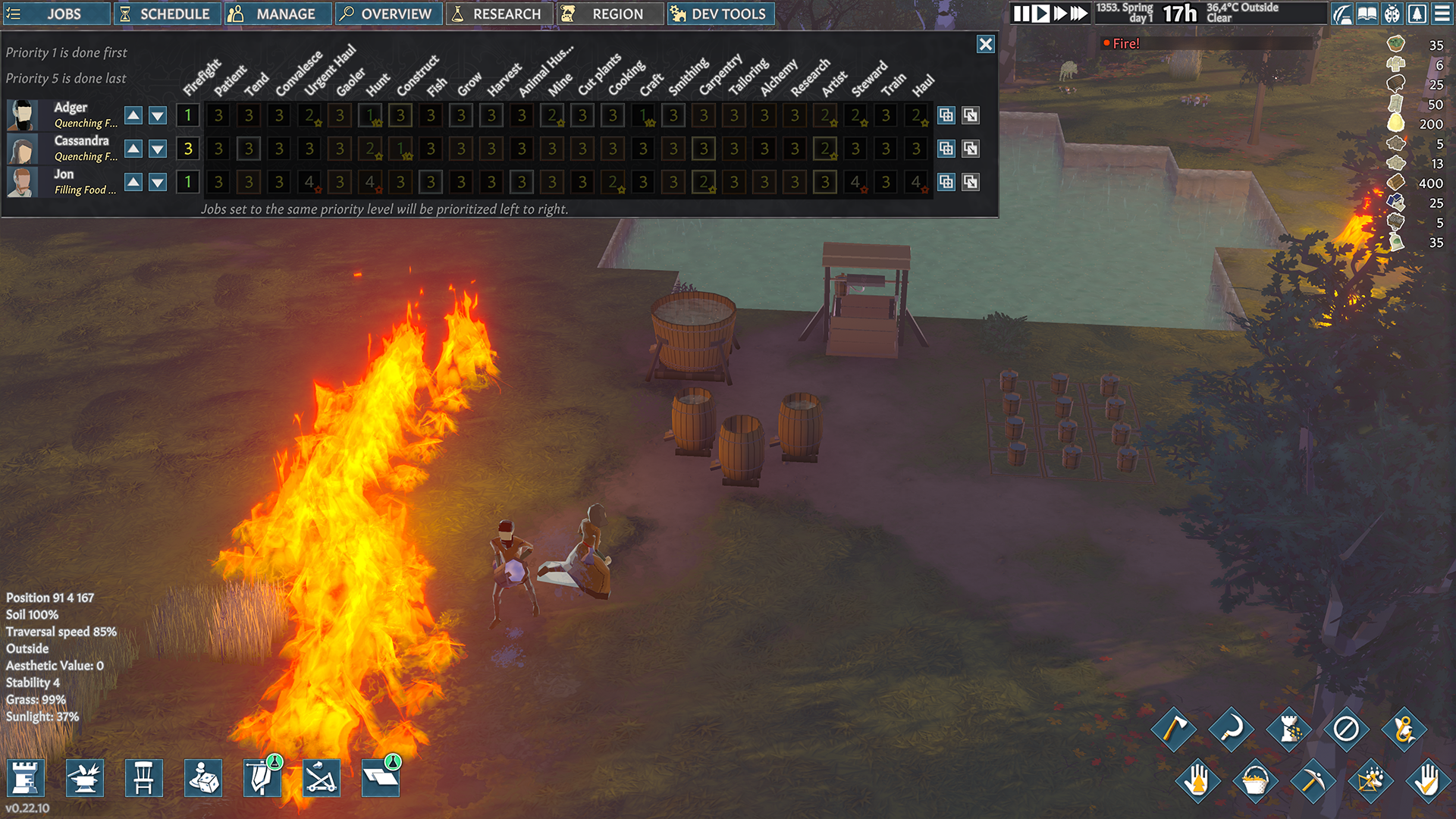 As mentioned, settlers with a Firefighter job will go and extinguish the fire. For bigger flames, they’ll need water. Here is how that will go:
