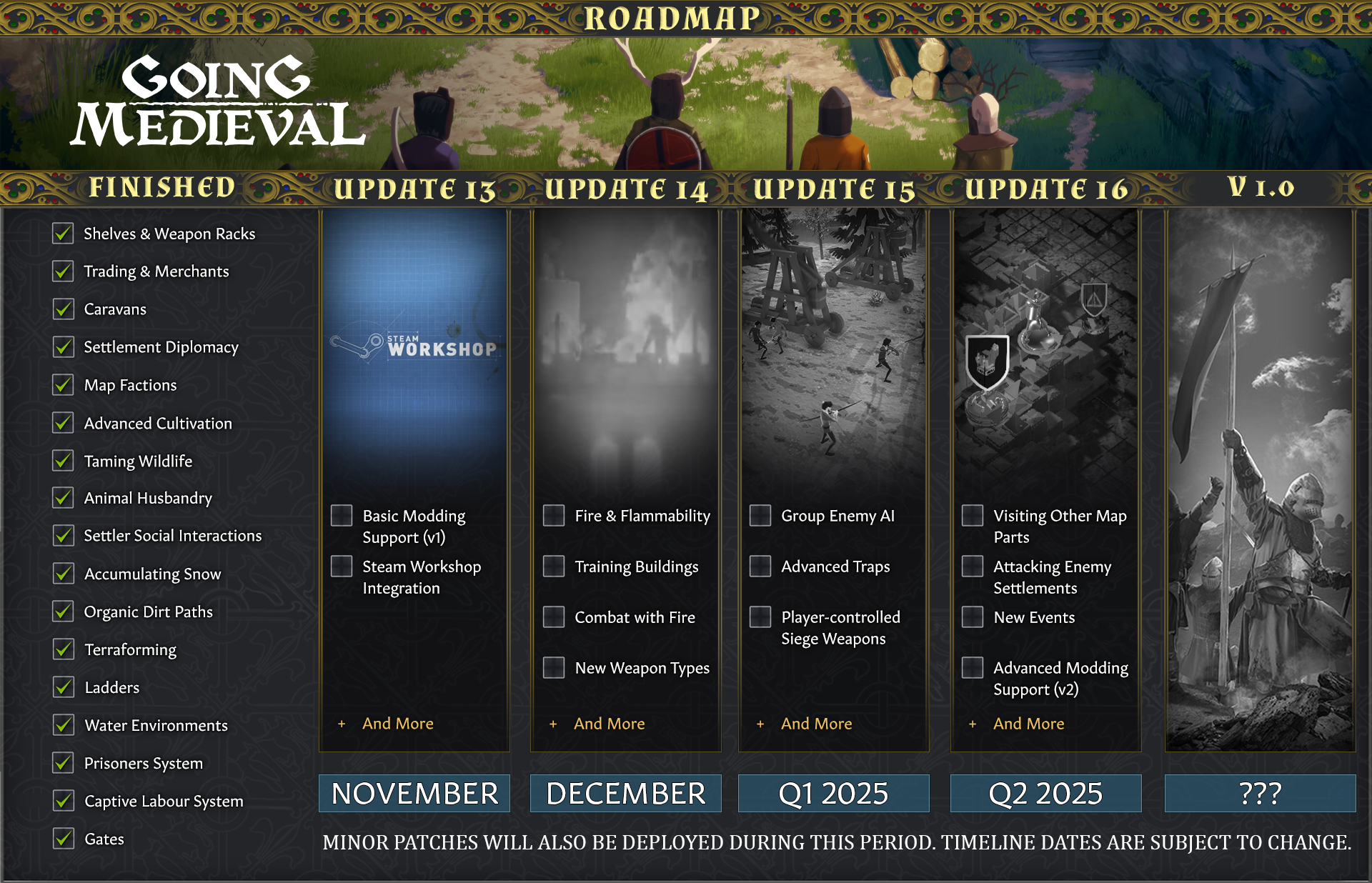 Greetings, medievalists! The newest patch (0.20.25) is now live on all platforms. Save your progress and restart your game client to update. You should be able to load normally and continue playing. If you have any problems, please let us know.