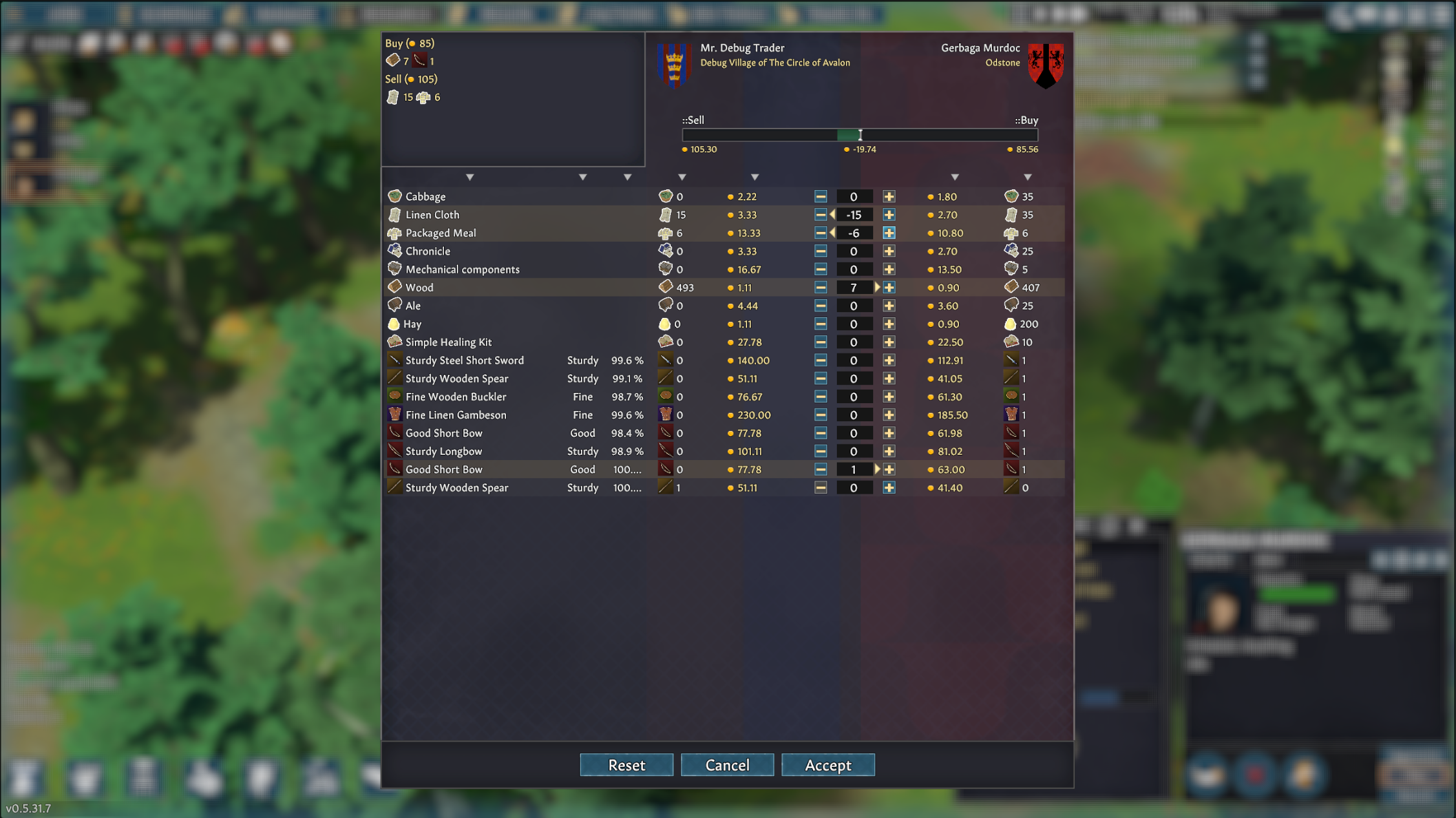 In the trading screen, the player determines what will be given to the trader and what will be taken. Players should keep their eyes on the scale, as it goes in favor of who has more wealth at the end of the transaction. One side represents the amount of wealth the player will take in the transaction, while the other represents what the player will give in the transaction. It’s important to keep the scale balanced, because if the player asks for more things than the trader offers - it may result in a dispute and the trader unwilling to do the transaction.
