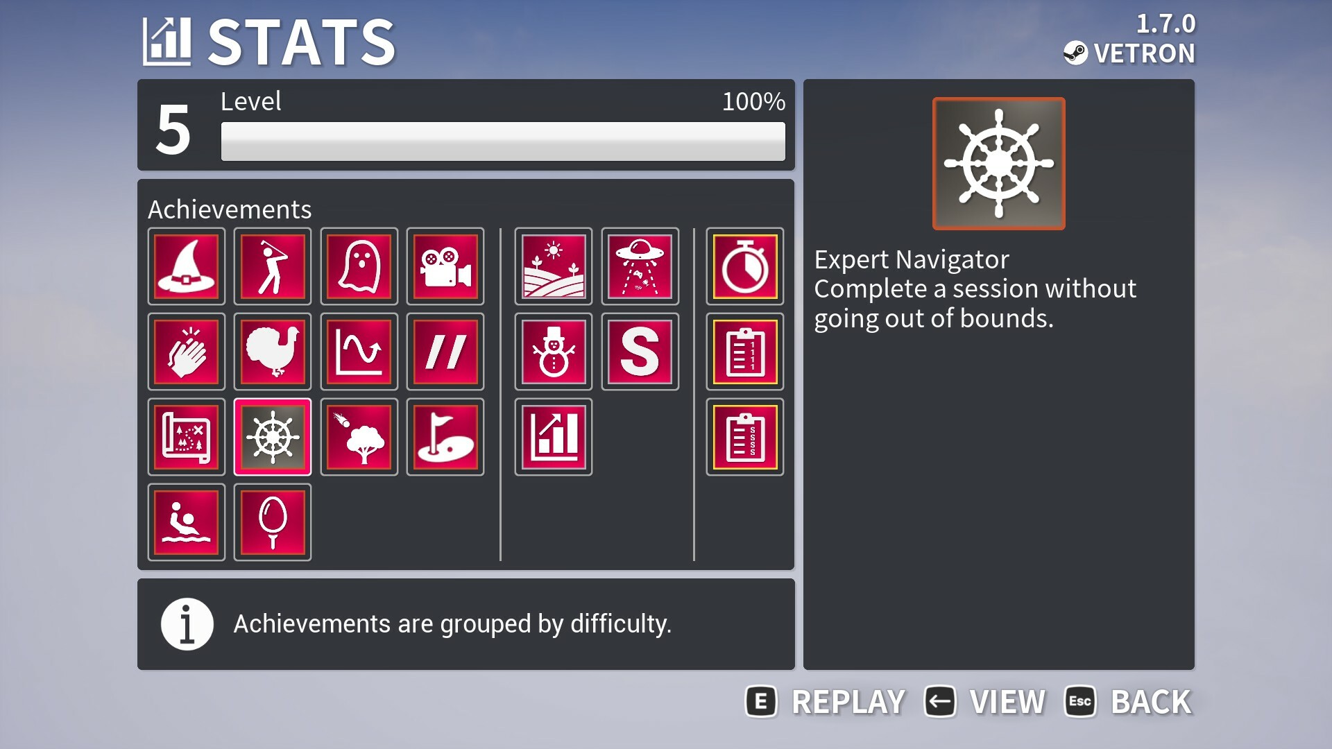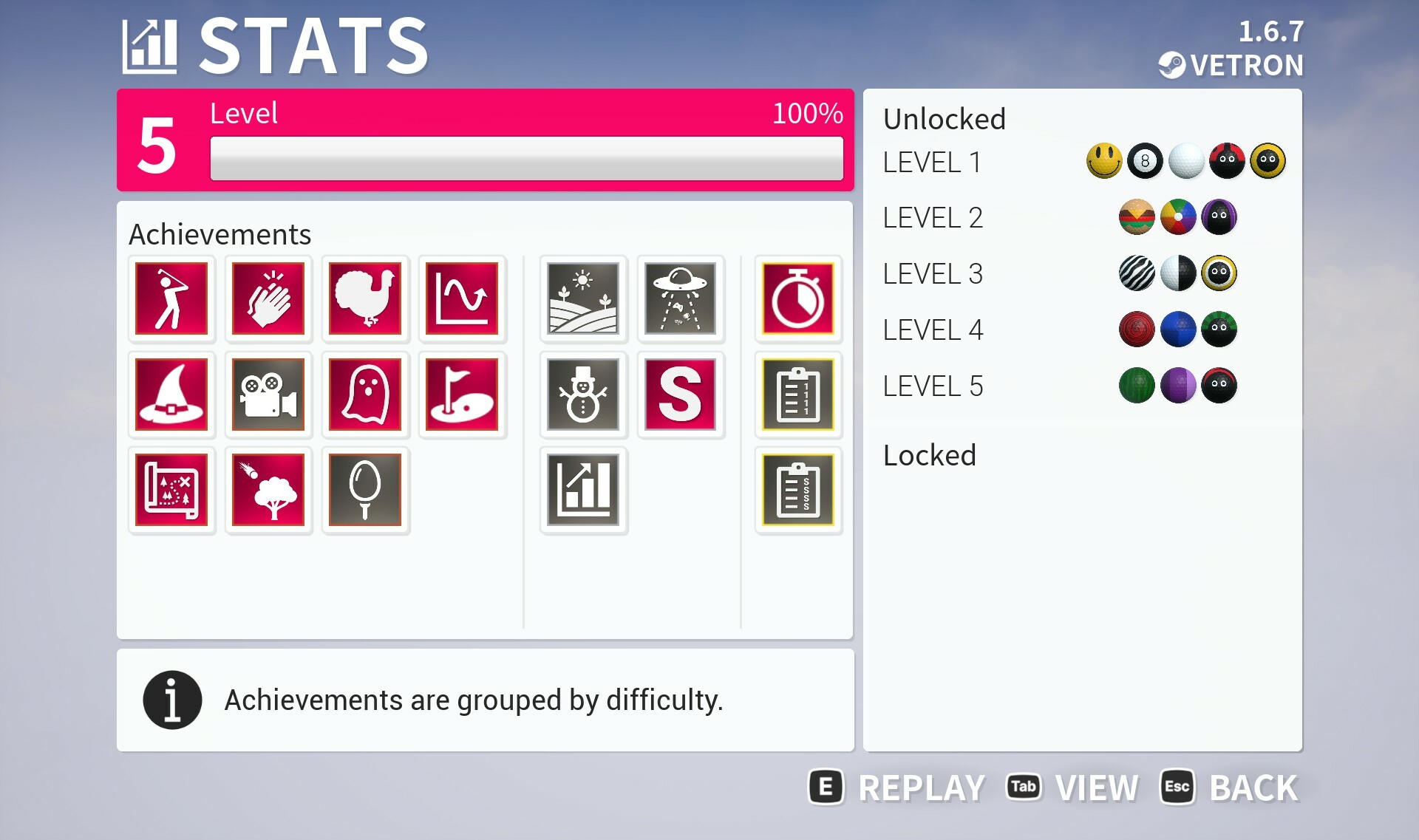 The stats menu now has a view toggle button which includes combined progression and achievement information. This is instead of the previous two additional sub menus. In this menu page you can navigate to select either your XP level or one of the achievements to read a description as well as any additional progress infromation.