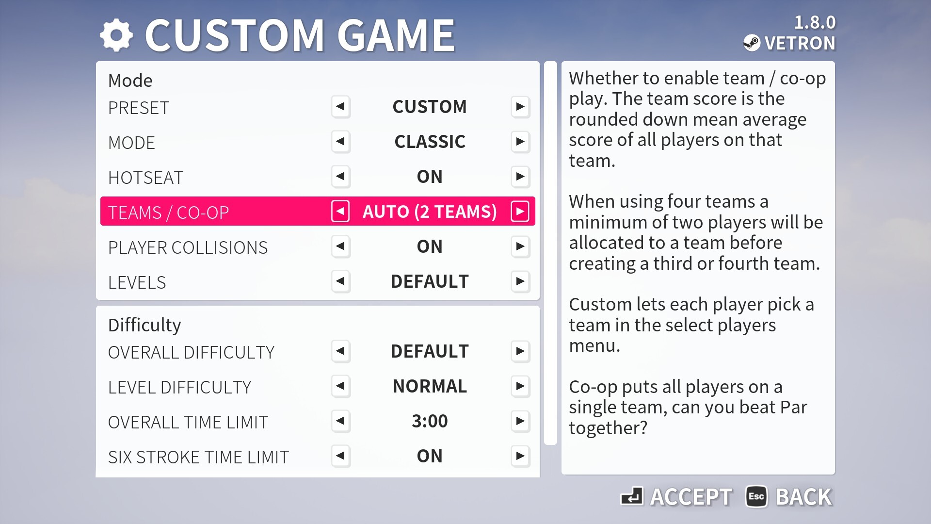 When creating a custom session online or offline, you now have the option to choose team scoring options. In this system, all scores on a team are summed up and divided among the team members, with rounding.