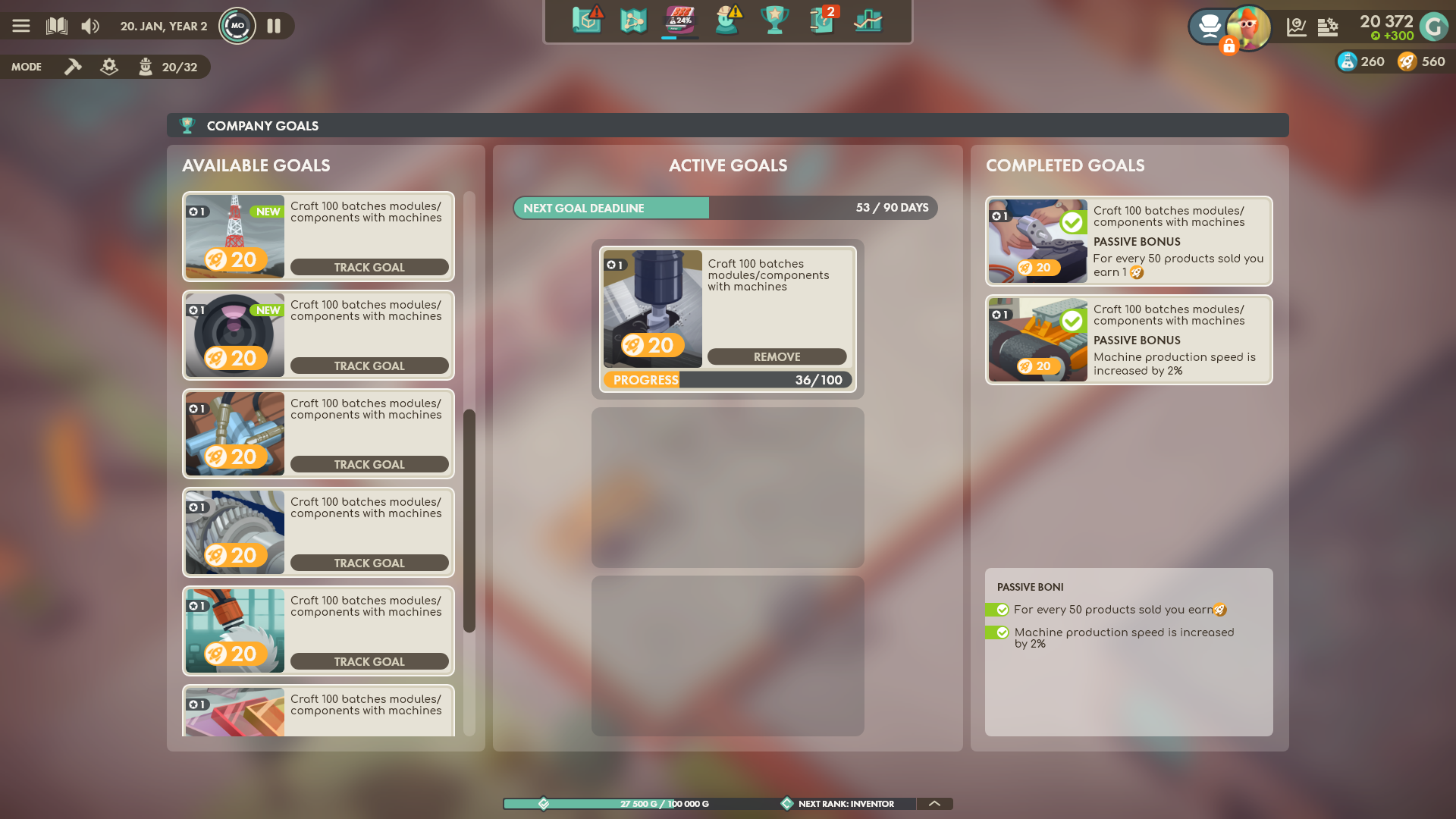 Soon, Company Goals will be spicing up your endeavours! These tasks can be taken on at anytime and blend in well with your daily company routines. Upon completion, Company Goals will always reward you a certain amount of Success Points depending on the difficulty, as well as a passive effect that will be permanently active. These range from buffs on production speeds to additional conditions to earn more Success Points while you progress through the game.