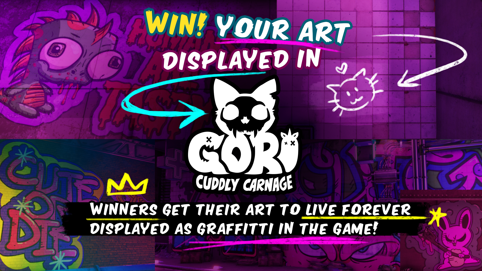 We want YOU to show us your artistic skills! Post your artwork and if you win, get it displayed in the game Gori: Cuddly Carnage! Decorating the walls FOREVER!! And your name as Graffitti artist in the rolling credits!
