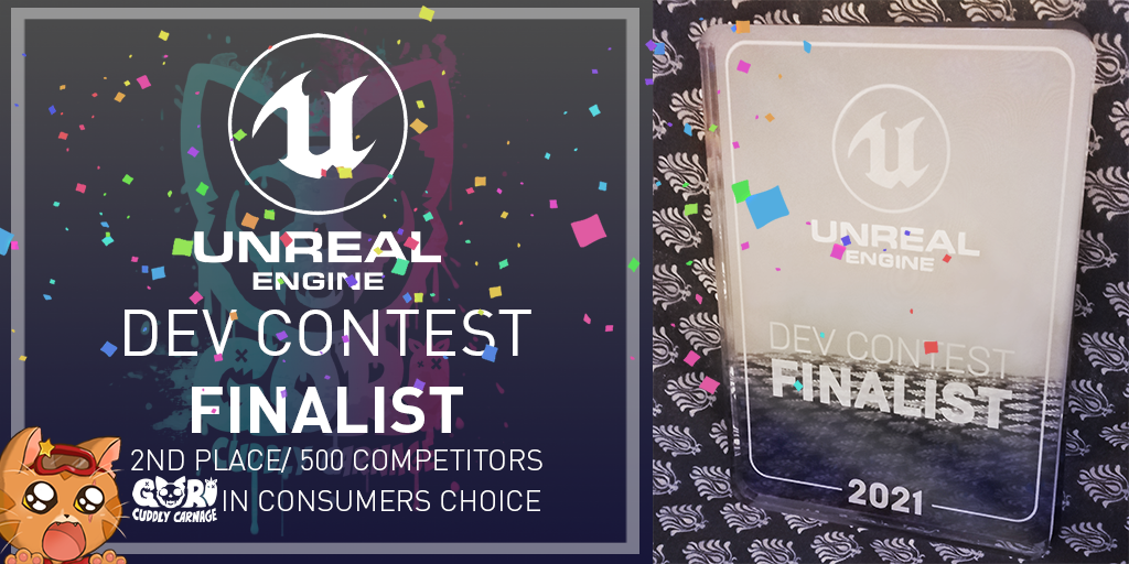 Gori: Cuddly Carnage got in 2nd place in Unreal's Consumers choice Dev contest. But with all the support and hype we got, it felt like gold!