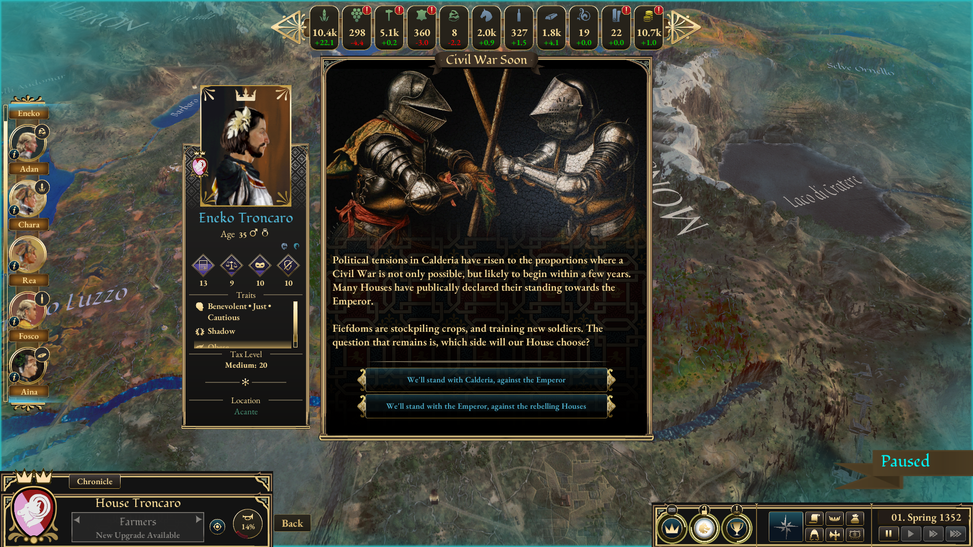 So the Civil War begins, gradually gaining momentum throughout the midgame while all the Houses pick their sides. The Emperor makes a grand entrance into the picture, and we catch glimpses of Calderia's Houses reclaiming their ancestral lands and the forgotten knowledge of the previous civilization. In other words, the Empire embodies medieval times, whereas Calderia inspires to go forward. This dualism now reveals more about where part of the inspiration for the game came from. Europe was transitioning from the Middle Ages to the Renaissance and then the Enlightenment, but when the world is changing, there are progressive forces and regressive forces, those who push for advancement and those who are resisting and in danger of losing something in the process. And all that change usually causes conflicts. While these struggles often arise from within, in Great Houses of Calderia, they are externalized through the entities of the Empire and Emperor.