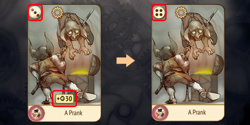 ːcardsː players: 2 ːscoreː victory condition: 35 points ːcursecardː Chaos Cards: allowed ːhealth_powerupː Character Abilities: allowed ːtelegramː Impending Misfortune: hidden ːcheatdiceː Characters: random ːRatsClockː Timer: normal ːLocationː Field: Clockwork colony