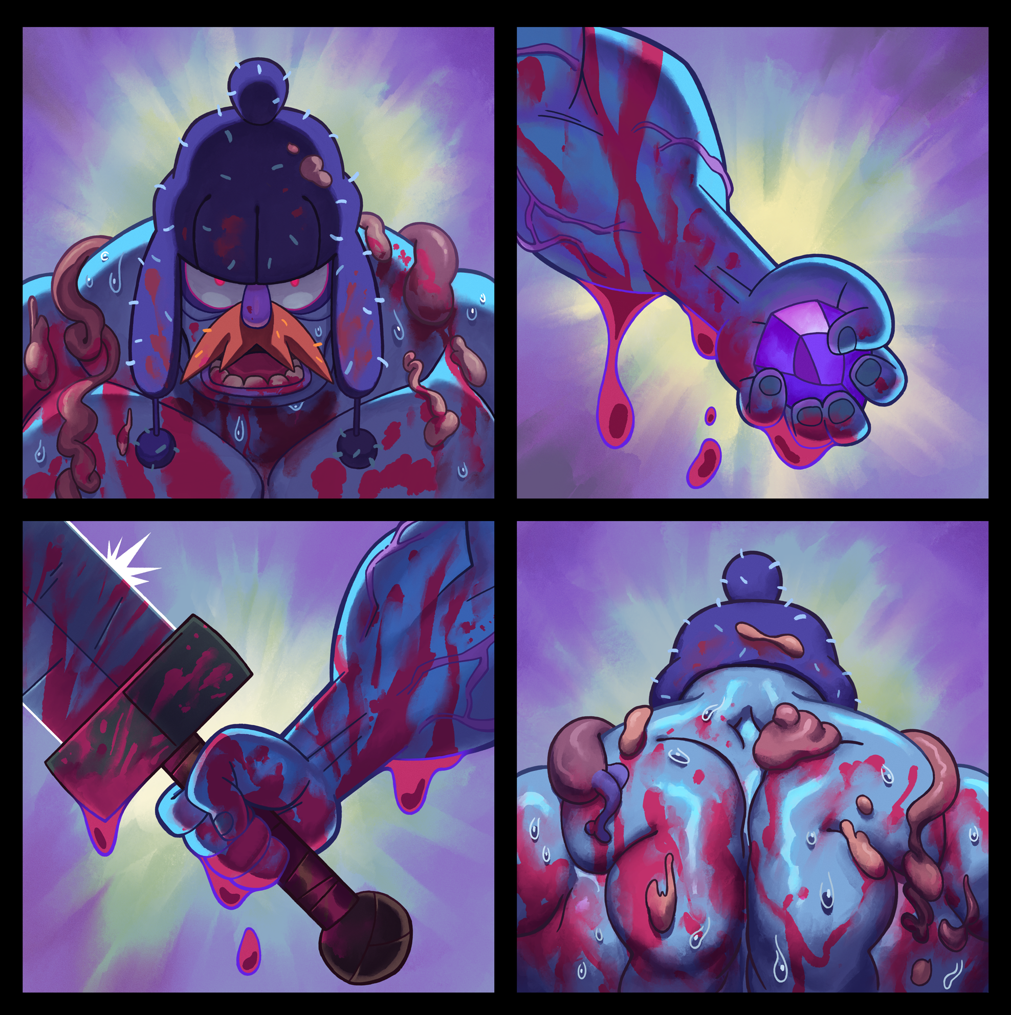 My initial instinct for the Royal Slob was to go full Henry VIII, complete with the frilly robe, puffy sleeves, and ornate scepter. Older designs featured a grindstone pendant as a reward for the player. I found the Renaissance elements a bit too removed from the Iron Age feel of Grindstone, however. I didnât want the Slob to feel out of place, and edited some of the fandier elements out. The scepter idea remained, with a grindstone reward in the scepter itself.